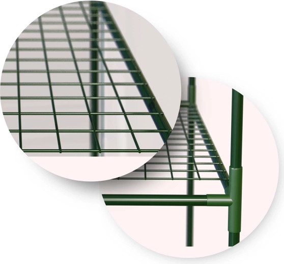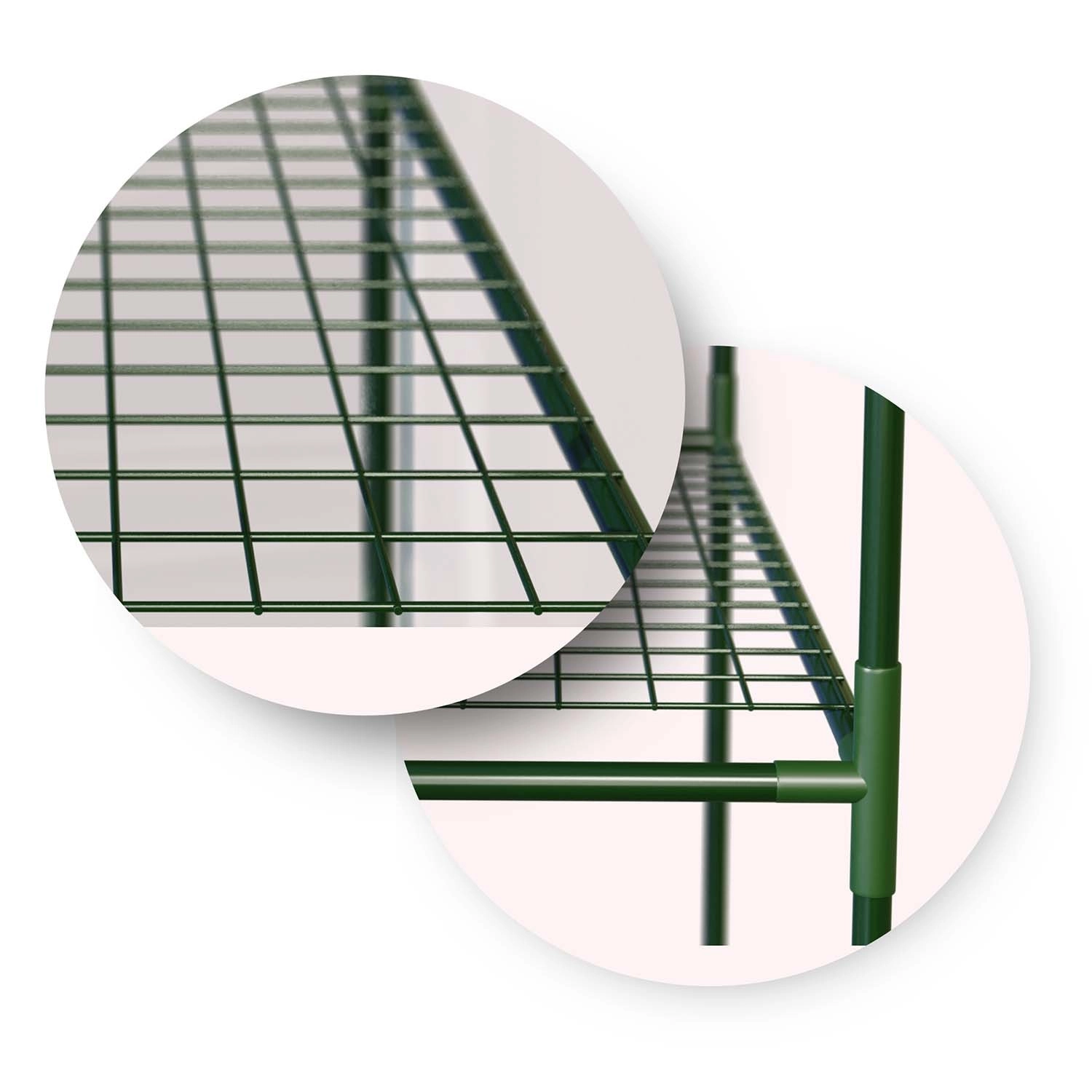 Meerlagige rekken met een draagvermogen tot 10 kg per plank besparen ruimte en organiseren de teelt. De voorste ritssluiting zorgt voor snelle ventilatie en eenvoudig onderhoud.