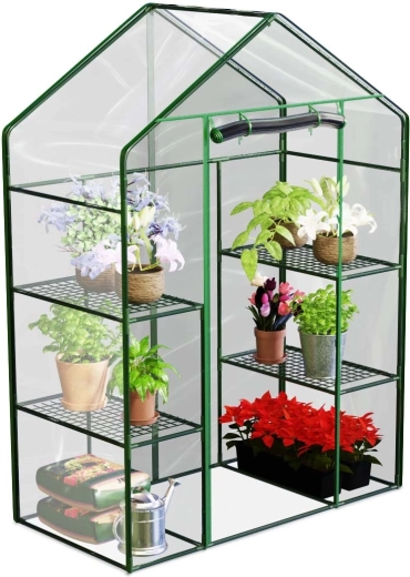 De praktische twee rijen planken maken verticale teelt mogelijk en benutten de ruimte efficiënt. Oprolbare voordeur met dubbele rits vergemakkelijkt de bediening en maakt het mogelijk de ventilatie te regelen. Onder de planken is voldoende ruimte voor tuingereedschap en bloempotten – alles binnen handbereik.