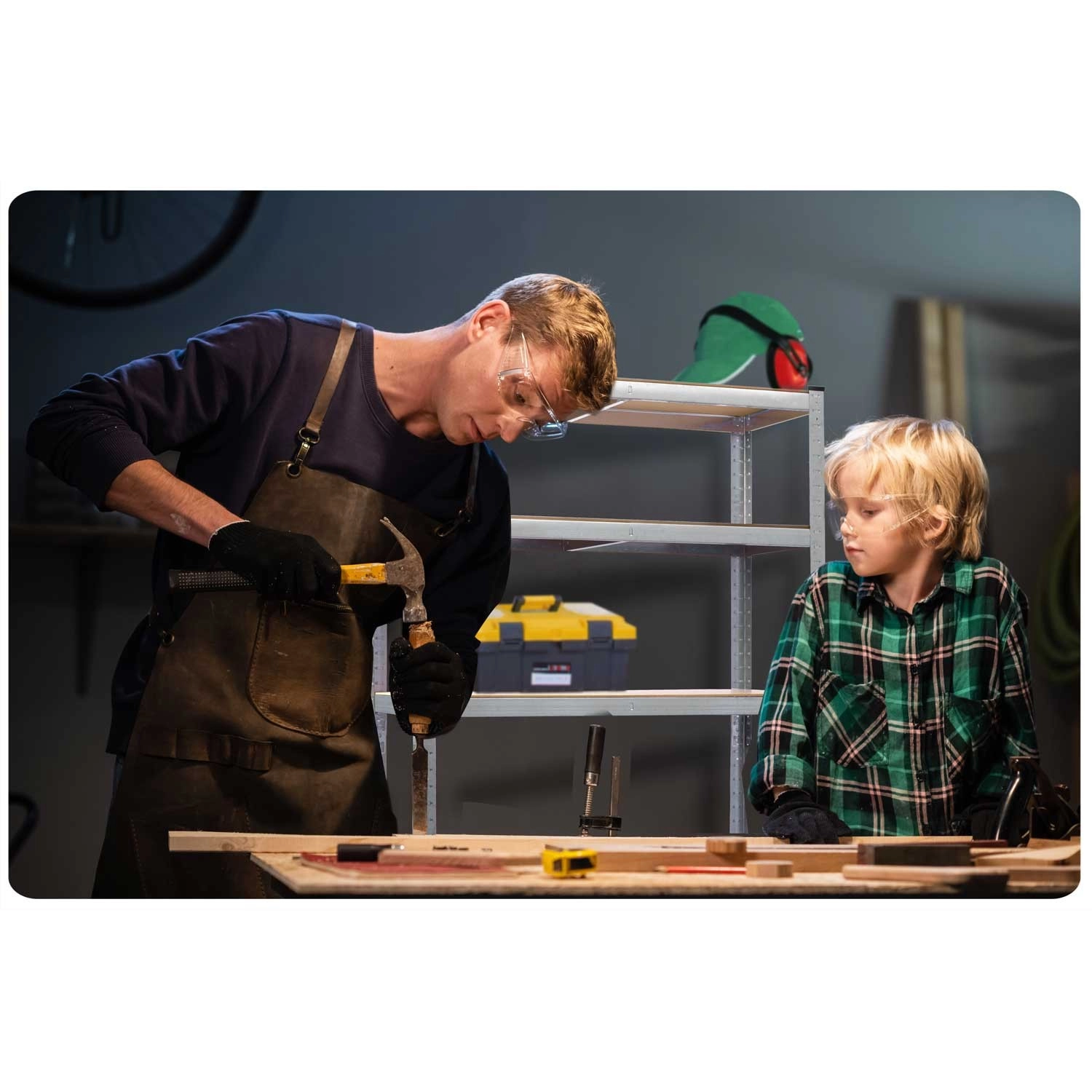 De montage verloopt zonder schroeven – met kliksysteem, zodat u de stelling snel kunt opbouwen zonder speciaal gereedschap. Afgeronde randen en beschermende voetdoppen verhogen de veiligheid en beschermen de vloer tegen krassen. Een praktisch voordeel is de mogelijkheid om de constructie in twee lagere stellingen te verdelen of deze te gebruiken als werkbank.
