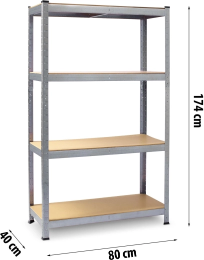 De hoogwaardige magazijnstelling PLONOS in elegant zilververzinkt is ontworpen voor veilige en overzichtelijke opslag van gereedschap, dozen en zwaardere voorwerpen. Stabiliteit wordt gegarandeerd door robuuste metalen profielen met een dikte van 0,5 mm en vier MDF legplanken van 3,3 mm dik, elk met een draagvermogen tot 150 kg. Afgeronde randen minimaliseren het risico op letsel bij hantering.