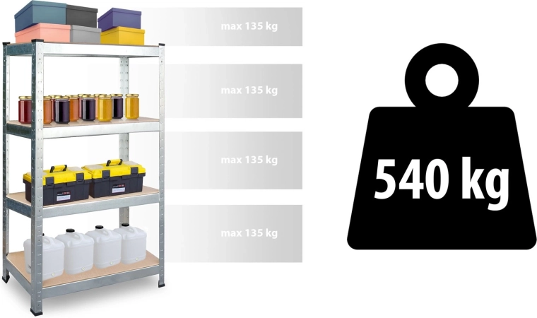 - Hoge draagkracht – tot 135 kg per legbord, totaal 540 kg
