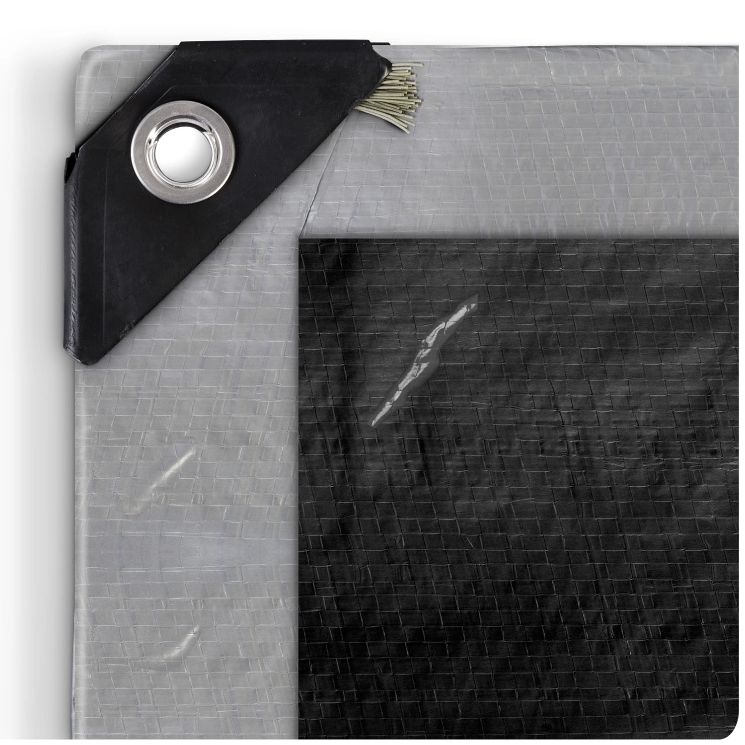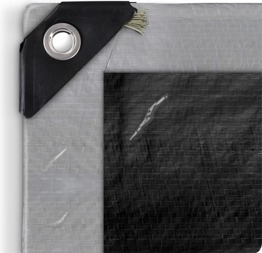 Praktische roestvrij stalen ogen maken snelle en stevige verankering eenvoudig. Versterkte hoeken en randen verhogen de duurzaamheid op de meest belaste punten. De tweekleurige uitvoering (zilver–zwart) maakt variabel gebruik mogelijk afhankelijk van gewenste warmte- en lichtreflectie/absorptie.