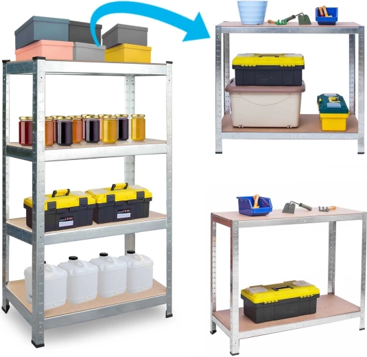 De stelling is eenvoudig aan te passen – stel de hoogte van de legborden per 40 mm in, splits in twee lagere delen of gebruik als werkbank.