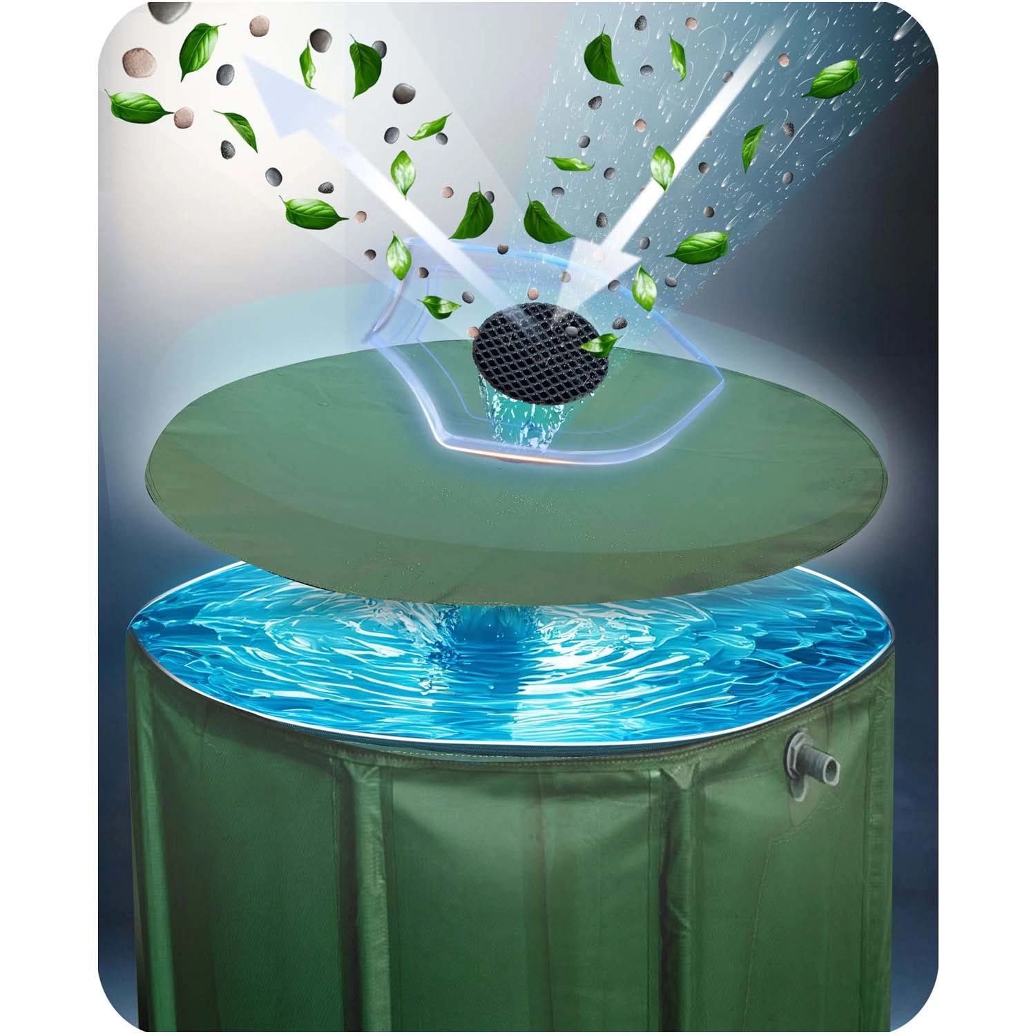 De bovenste inlaat voor het opvangen van regenwater vanaf de regenpijp wordt aangevuld met een fijnmazige zeef die bladeren en vuil tegenhoudt – het water blijft schoon voor bewatering.