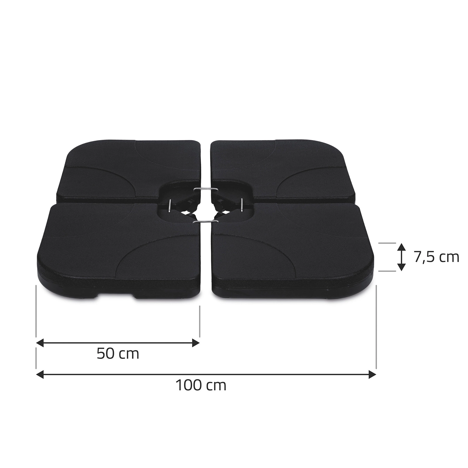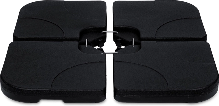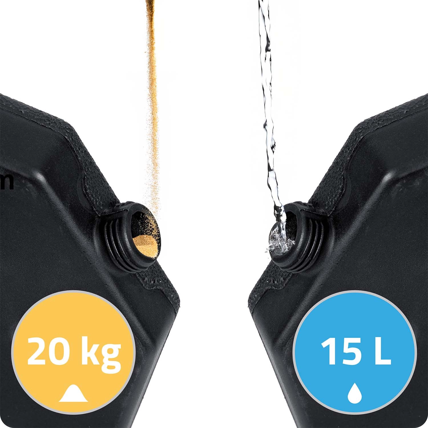 Vier onderling koppelbare segmenten omsluiten de kruisvoet van je parasol en vormen een compacte, zware basis. Door te vullen met water (tot 4 × 15 l) of zand (tot 4 × 20 kg) kies je eenvoudig het ideale gewicht voor verschillende weersomstandigheden. Het HDPE-materiaal is licht hanteerbaar en tegelijk zeer goed bestand tegen mechanische beschadiging.