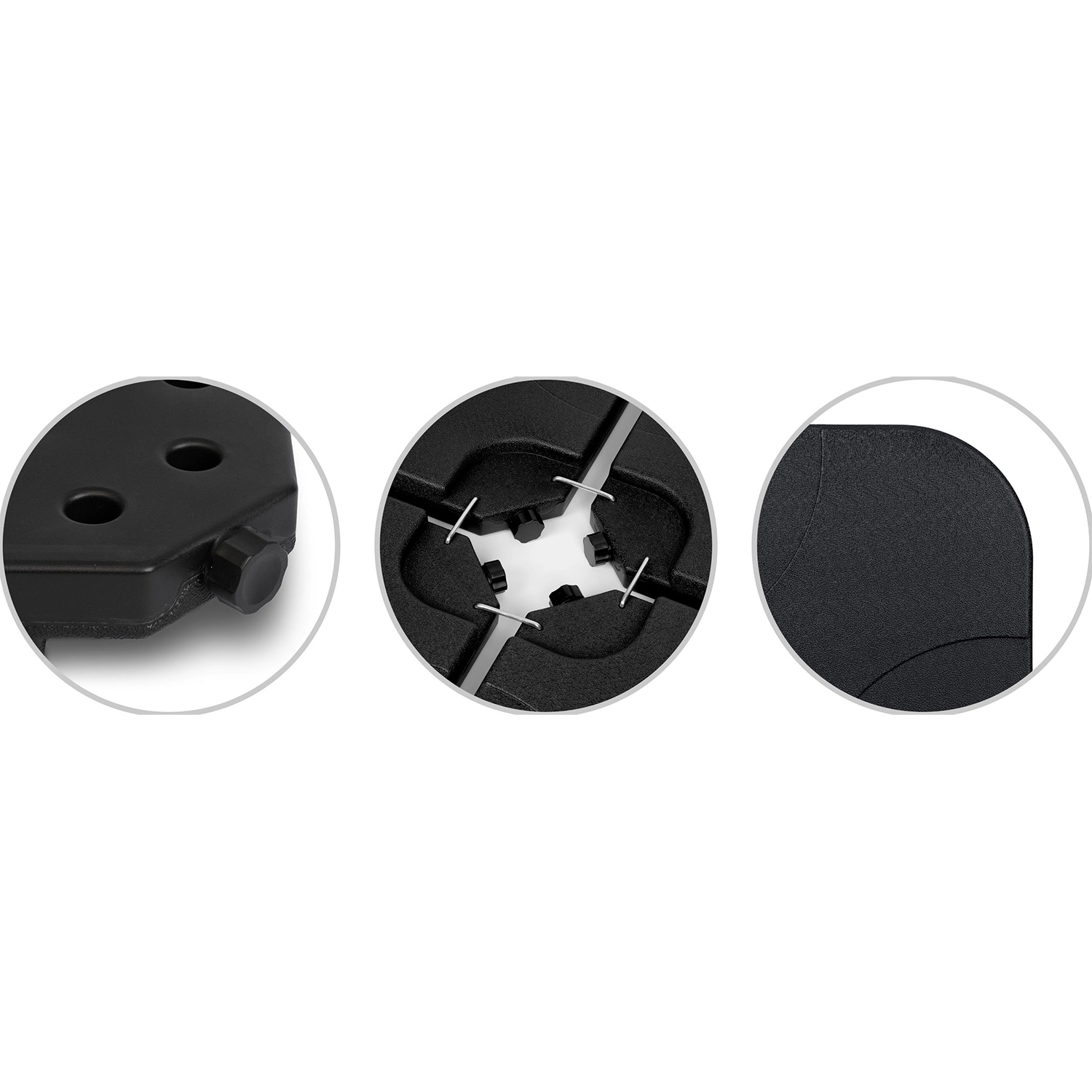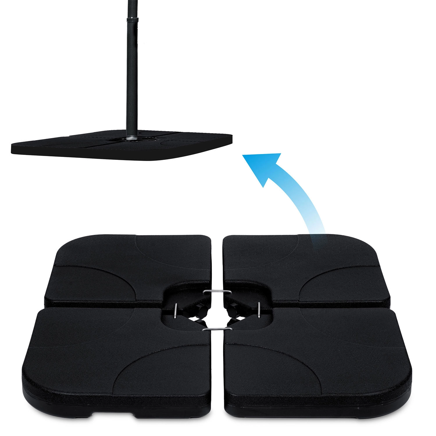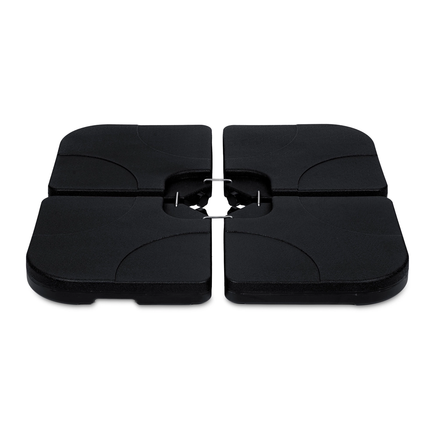 Vier onderling koppelbare segmenten omsluiten de kruisvoet van je parasol en vormen een compacte, zware basis. Door te vullen met water (tot 4 × 15 l) of zand (tot 4 × 20 kg) kies je eenvoudig het ideale gewicht voor verschillende weersomstandigheden. Het HDPE-materiaal is licht hanteerbaar en tegelijk zeer goed bestand tegen mechanische beschadiging.
