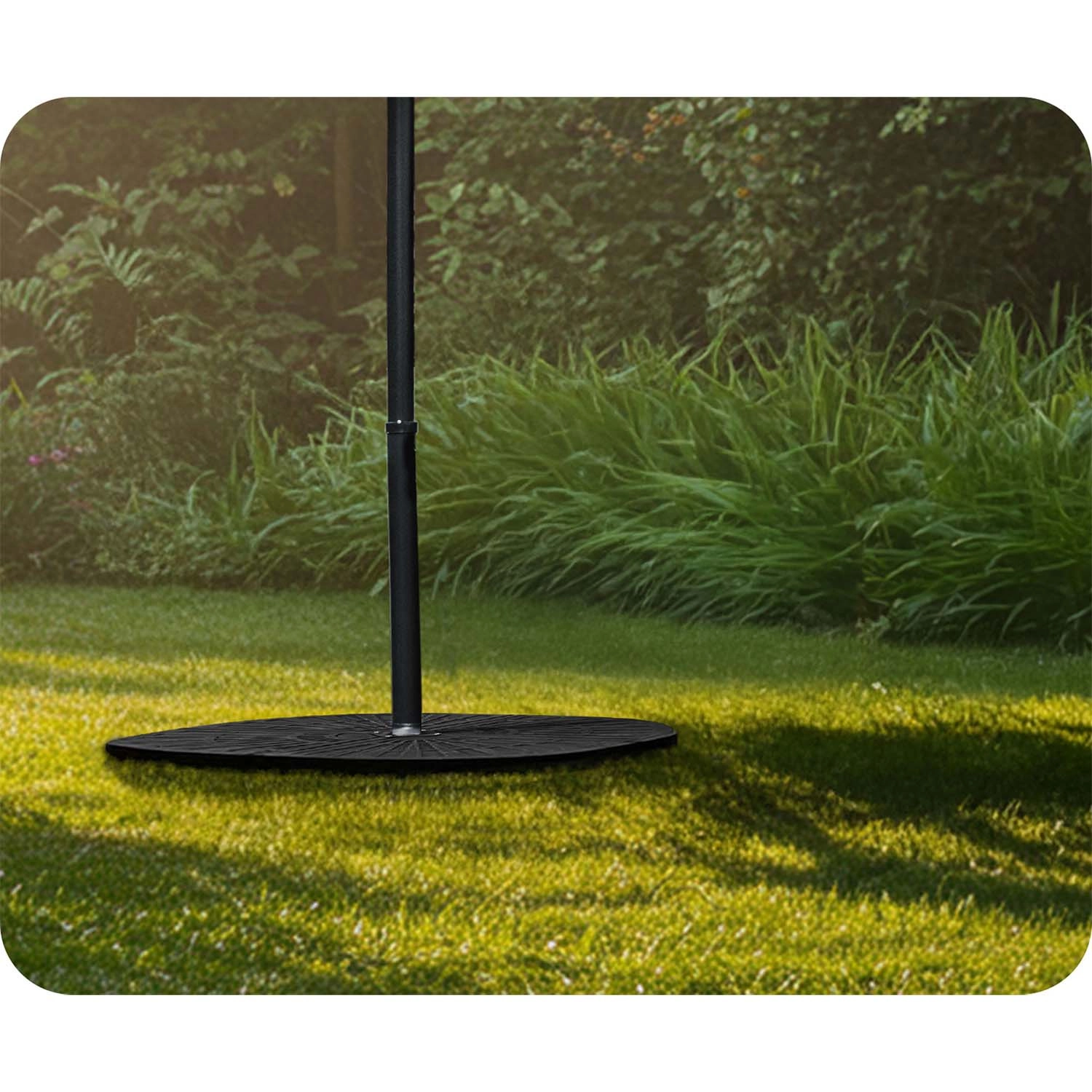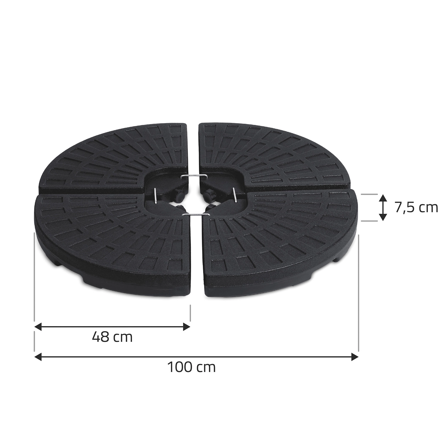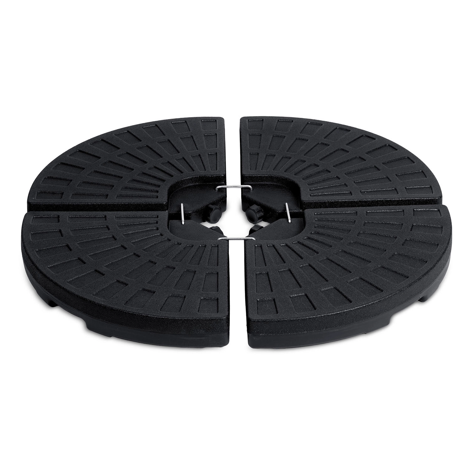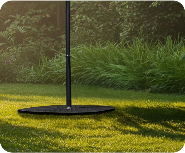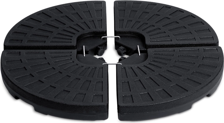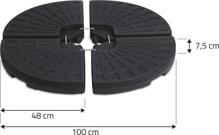 Vier onderling verbonden segmenten omsluiten de mast stevig en vormen een compacte ronde basis, die de stabiliteit van de parasol ook bij winderig weer verhoogt.