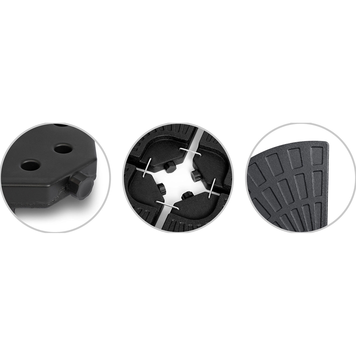 De montage is snel en intuïtief: de vier delen omsluiten de parasolmast en metalen haken (meegeleverd) verbinden ze stevig. Het getextureerde oppervlak verhoogt de grip op de ondergrond en de vulopeningen maken comfortabel vullen en legen mogelijk. Ideale oplossing voor terrassen, tuinen en horecaterrassen.