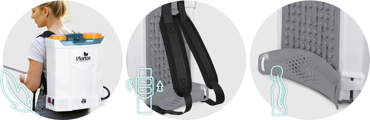 Gewatteerde, verstevigde en verstelbare riemen, een lendensteun en een ergonomische tank zorgen voor comfort, ook bij langer werken. De telescopische RVS-lans maakt nauwkeurig richten van de sproeiing eenvoudig.