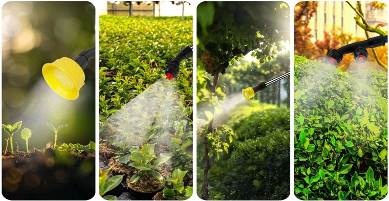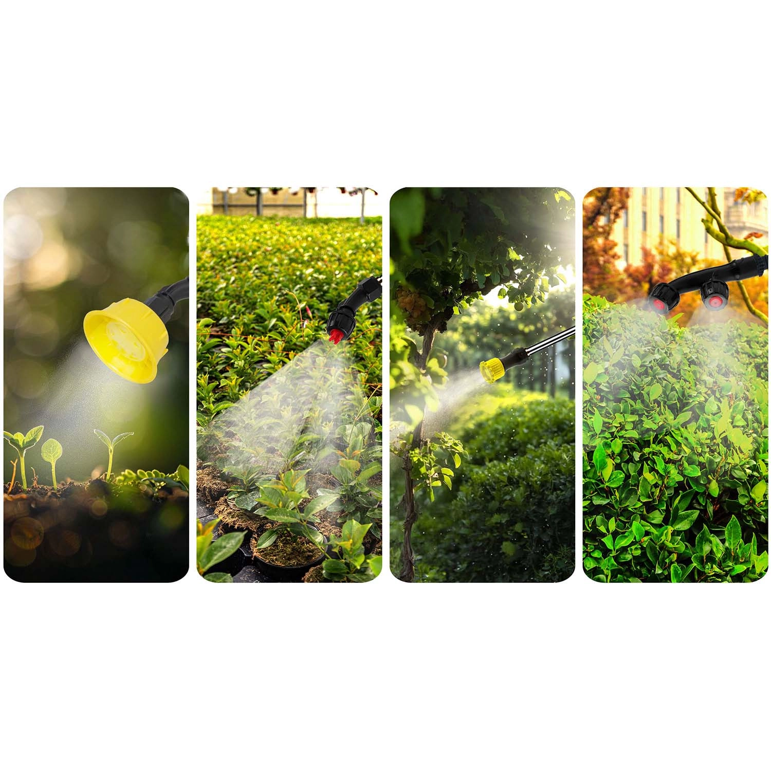 Kies het ideale sproeipatroon: fijne nevel voor gevoelige planten, vlakke straal voor precies werk, een viervoudig verstelbare sproeikop voor universeel gebruik of een dubbele kop voor snel bedekken van bredere perken.