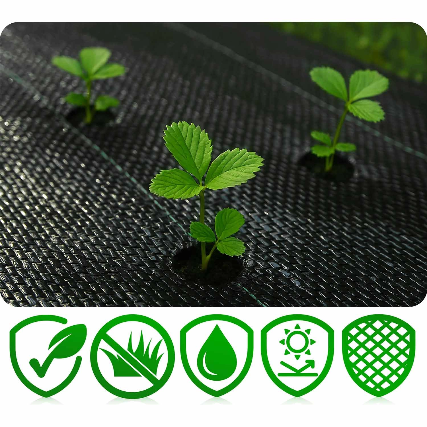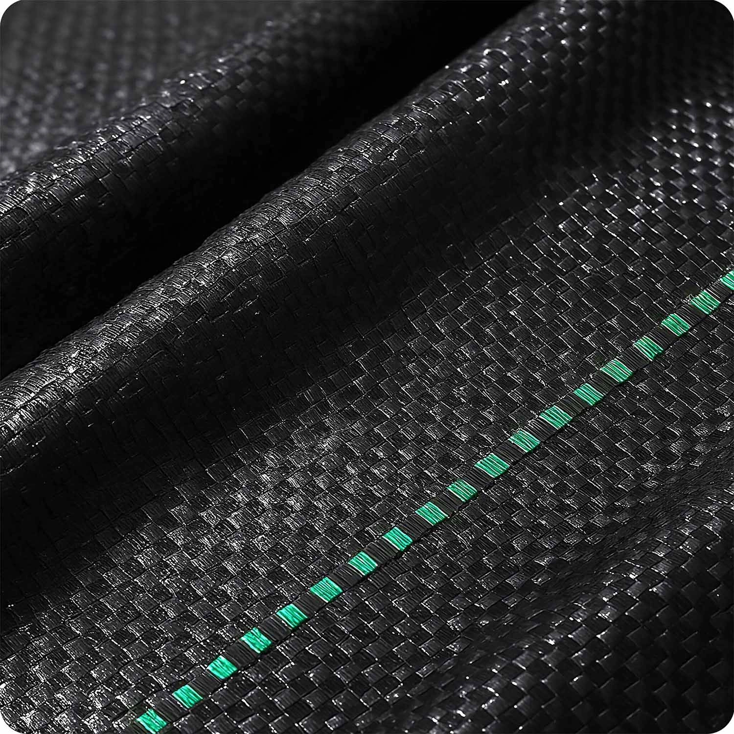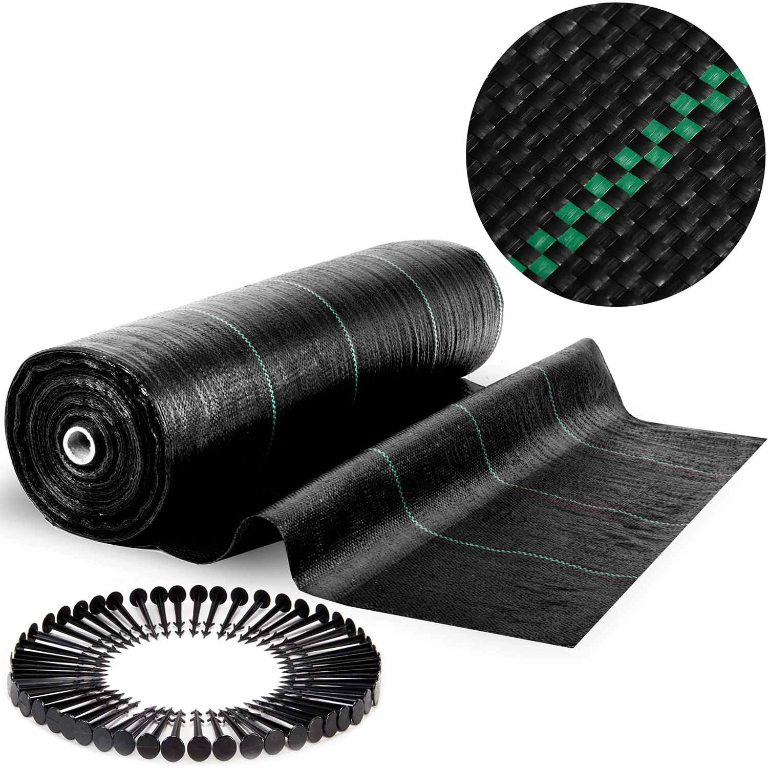 De textiel is weerbestendig – tegen regen, felle zon, vorst en temperatuurschommelingen. De versterkte geweven structuur is sterk en slijtvast, terwijl groene hulplijnen rechte sneden en precieze plaatsing vergemakkelijken. In de verpakking vindt u ook 50 kunststof pennen voor een snelle en veilige verankering aan de ondergrond.