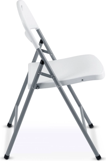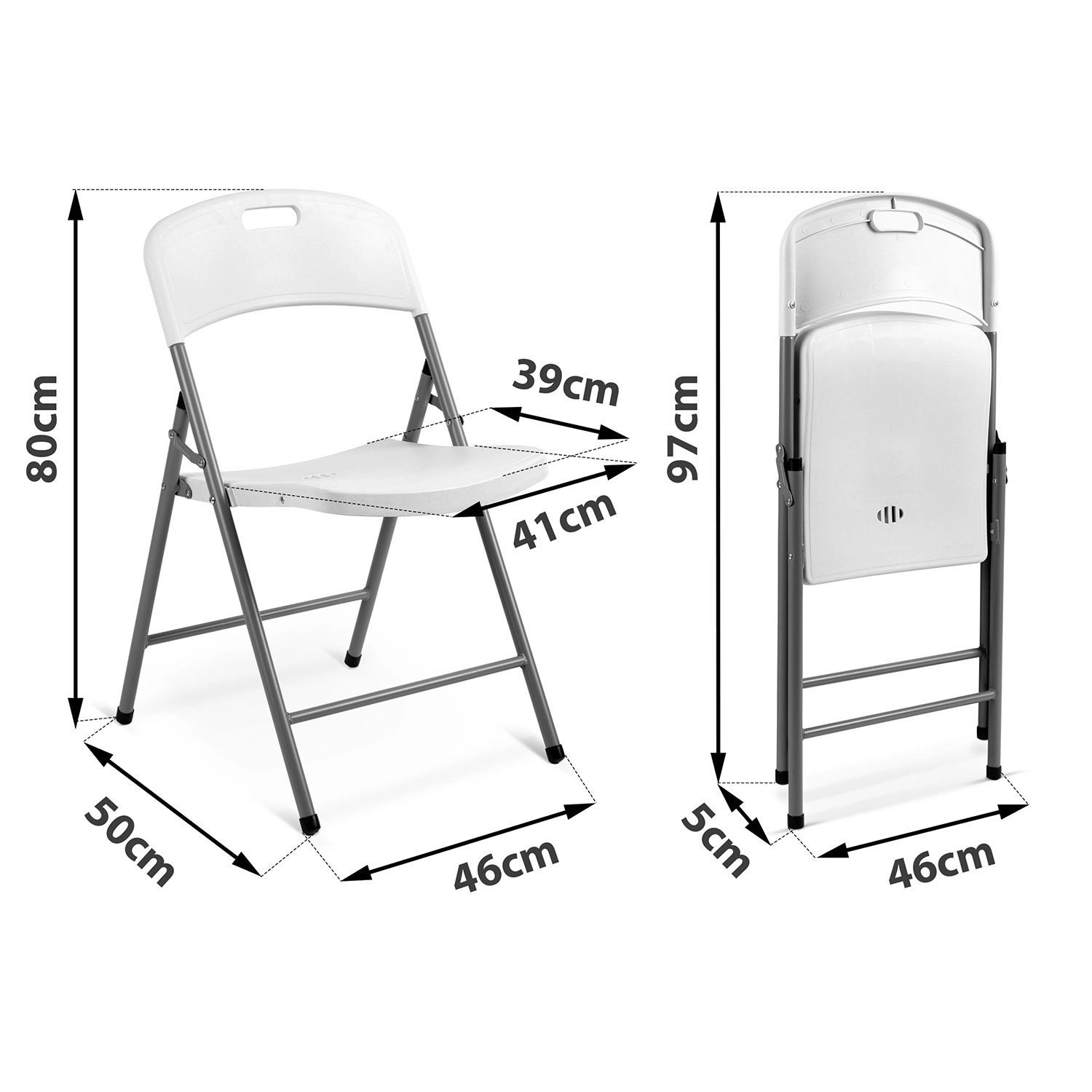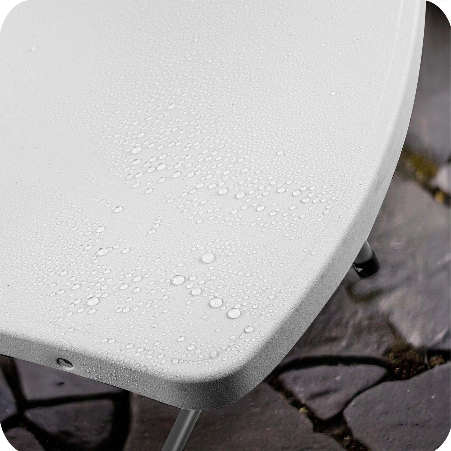 De stoelen vouwen plat en nemen daardoor minimale ruimte in bij het opbergen. Het water- en UV-bestendige oppervlak is eenvoudig te reinigen en droogt snel — ideaal voor buitengebruik, catering en feestjes thuis. Anti-slip doppen aan de poten beschermen de vloer en verhogen de stabiliteit.