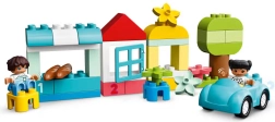 LEGO DUPLO Box met blokken is de ideale startset voor de allerkleinste bouwers. De set bevat 65 kleurrijke onderdelen, waaronder een autootje met bewegende wielen, ramen, een dak, bloemen, een baguette, DUPLO-figuren en stenen met de cijfers 1–3. De robuuste opbergdoos maakt opbergen en meenemen eenvoudig, en de grote, veilige onderdelen stimuleren creativiteit, fijne motoriek en ruimtelijk inzicht.