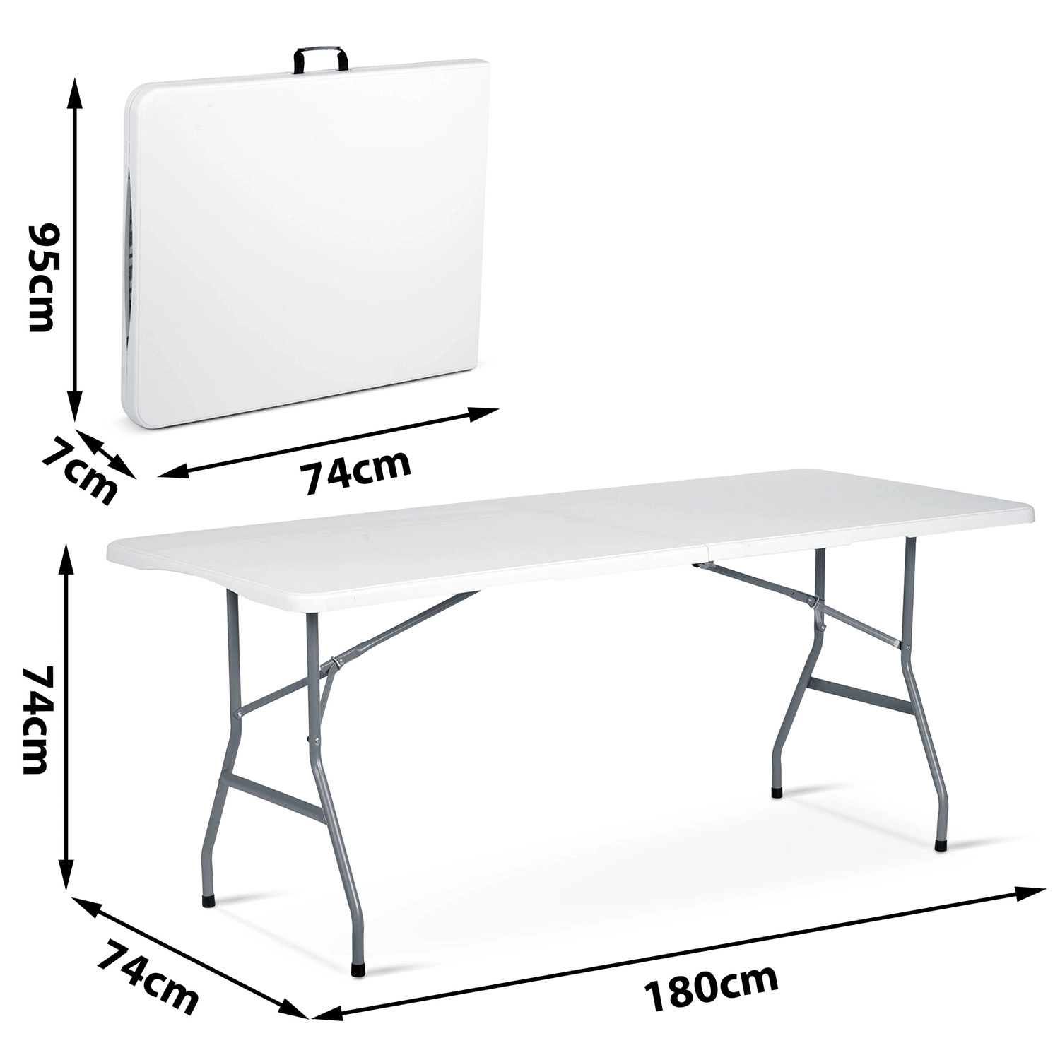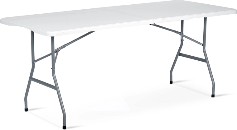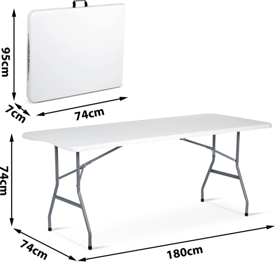 De betrouwbare inklapbare tafel van 180 cm is een uitstekende keuze voor tuin, terras en binnenruimtes. Het robuuste stalen frame met poedercoating zorgt voor stabiliteit en een lange levensduur, terwijl het PE-blad bestendig is tegen water, UV en vlekken. Dankzij de inklapbare constructie zet je hem in een handomdraai op en berg je hem na het evenement weer gemakkelijk op.