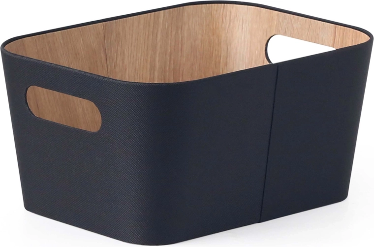 Praktische opbergmand in elegant zwart voor een overzichtelijke organisatie van het huishouden. Ideaal voor in kasten, op planken of op een commode. Gemaakt van een combinatie van papier en karton: licht, stabiel en milieuvriendelijk. Dankzij de compacte afmetingen 23 × 30,5 × 15,2 cm past hij in kleinere ruimtes en helpt hij spullen op hun plek te houden. Stijlvol design, universele toepassing en eenvoudig onderhoud voor dagelijks orde houden.