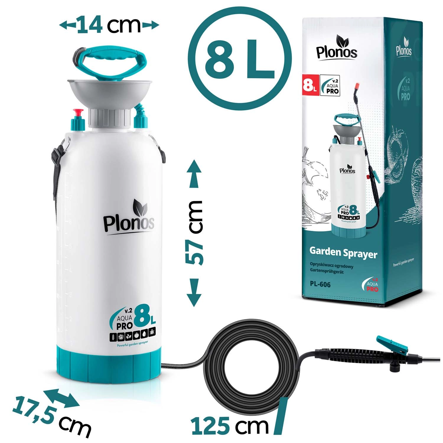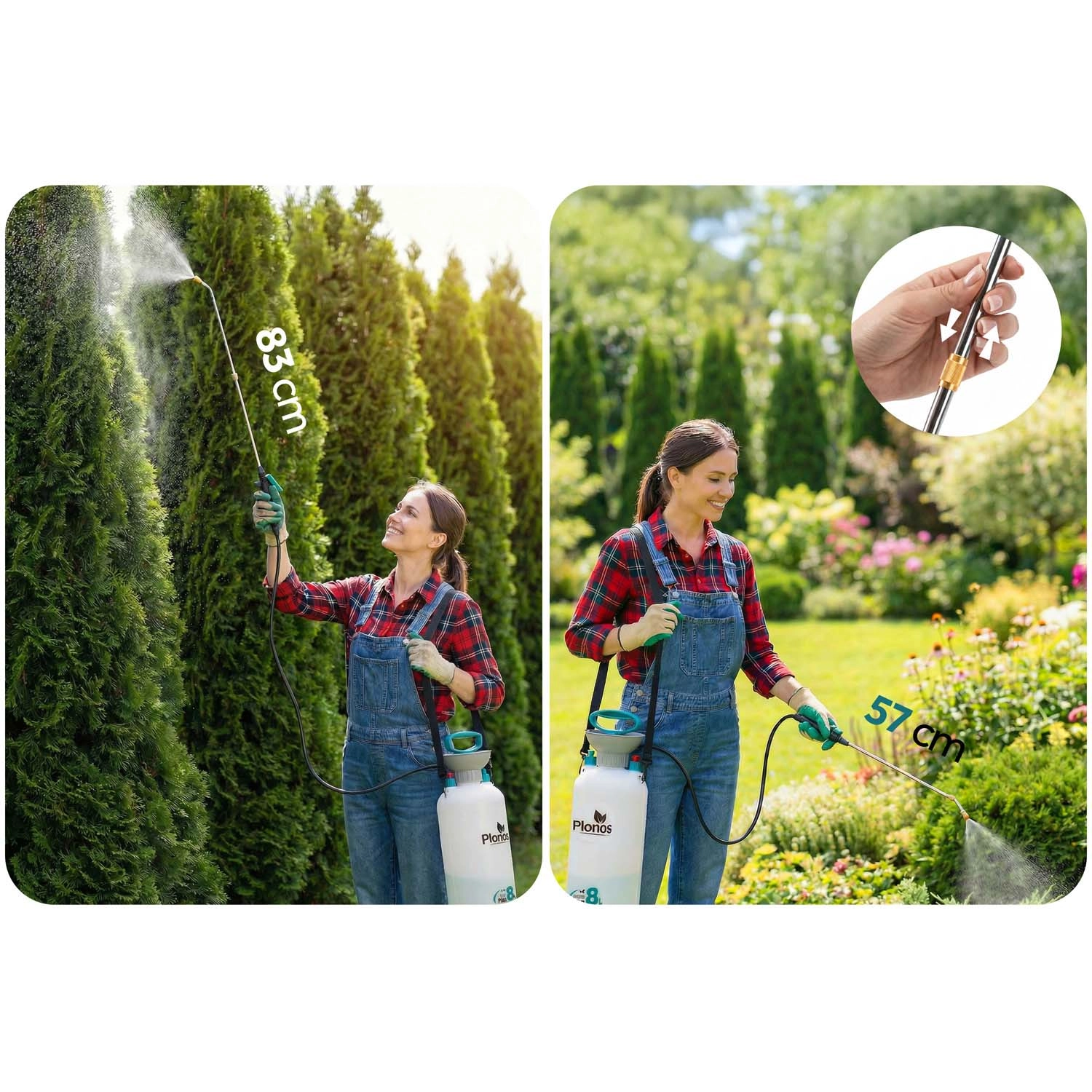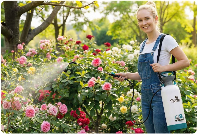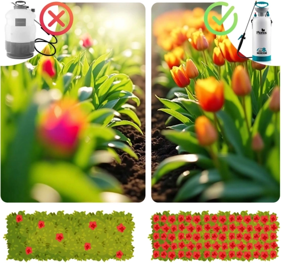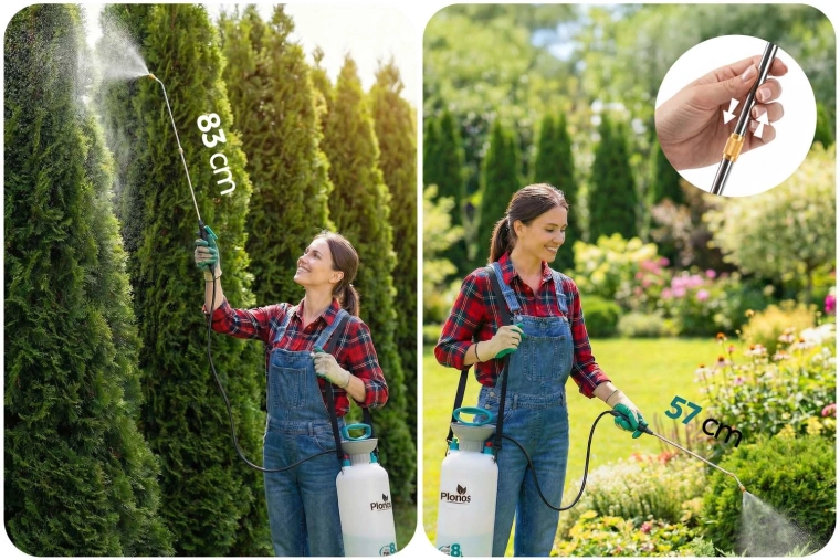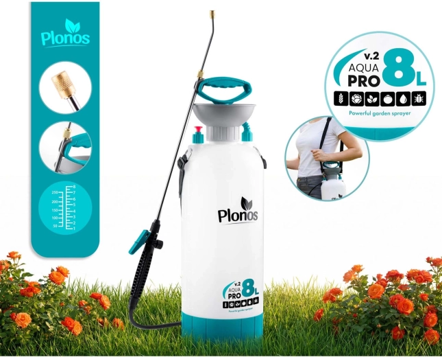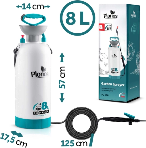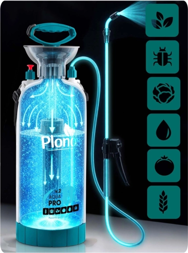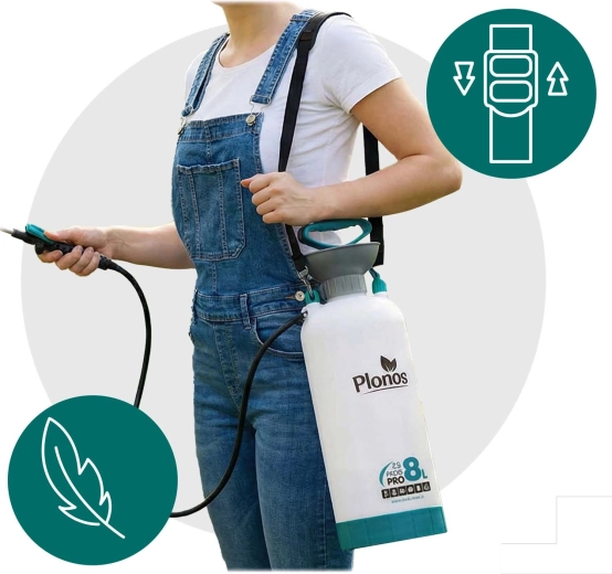 De Plonos 8 l drukspuit is een betrouwbare hulp voor dagelijks tuinieren. Dankzij hoogwaardige materialen – roestvrij staal, messing en duurzaam PE – is hij bestand tegen chemische middelen en langdurig gebruik. De geregelde druk van 2,76 bar verdeelt de vloeistof gelijkmatig en garandeert precieze resultaten bij het besproeien van bloemen, groenten, struiken en bomen.