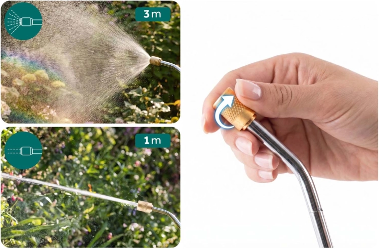 Van fijne nevel tot krachtige straal – met de traploze instelling pas je de doorstroming aan elke taak aan. Duurzame metalen weerstaan chemicaliën beter en zorgen voor een lange levensduur zonder verstoppingen.