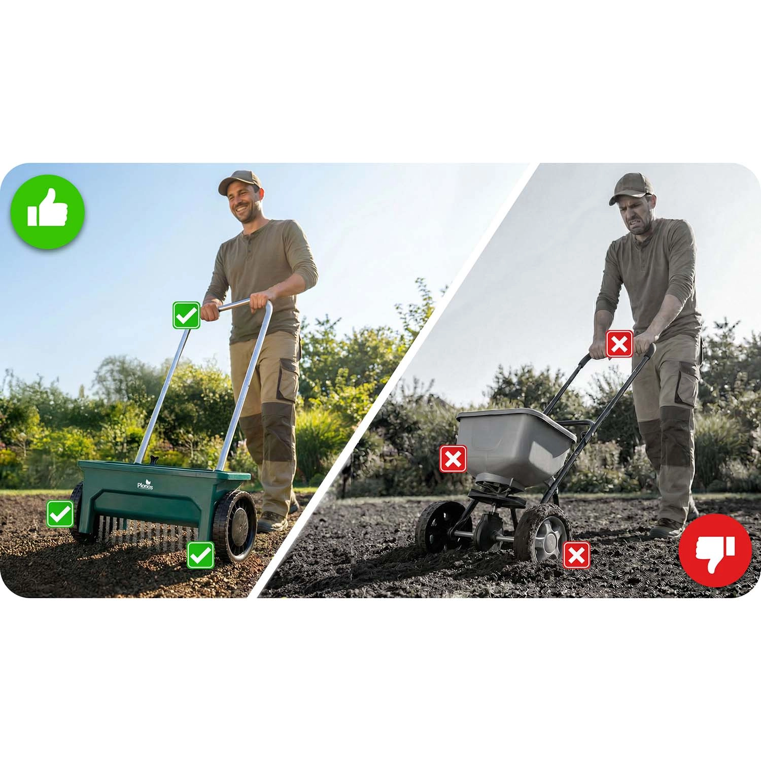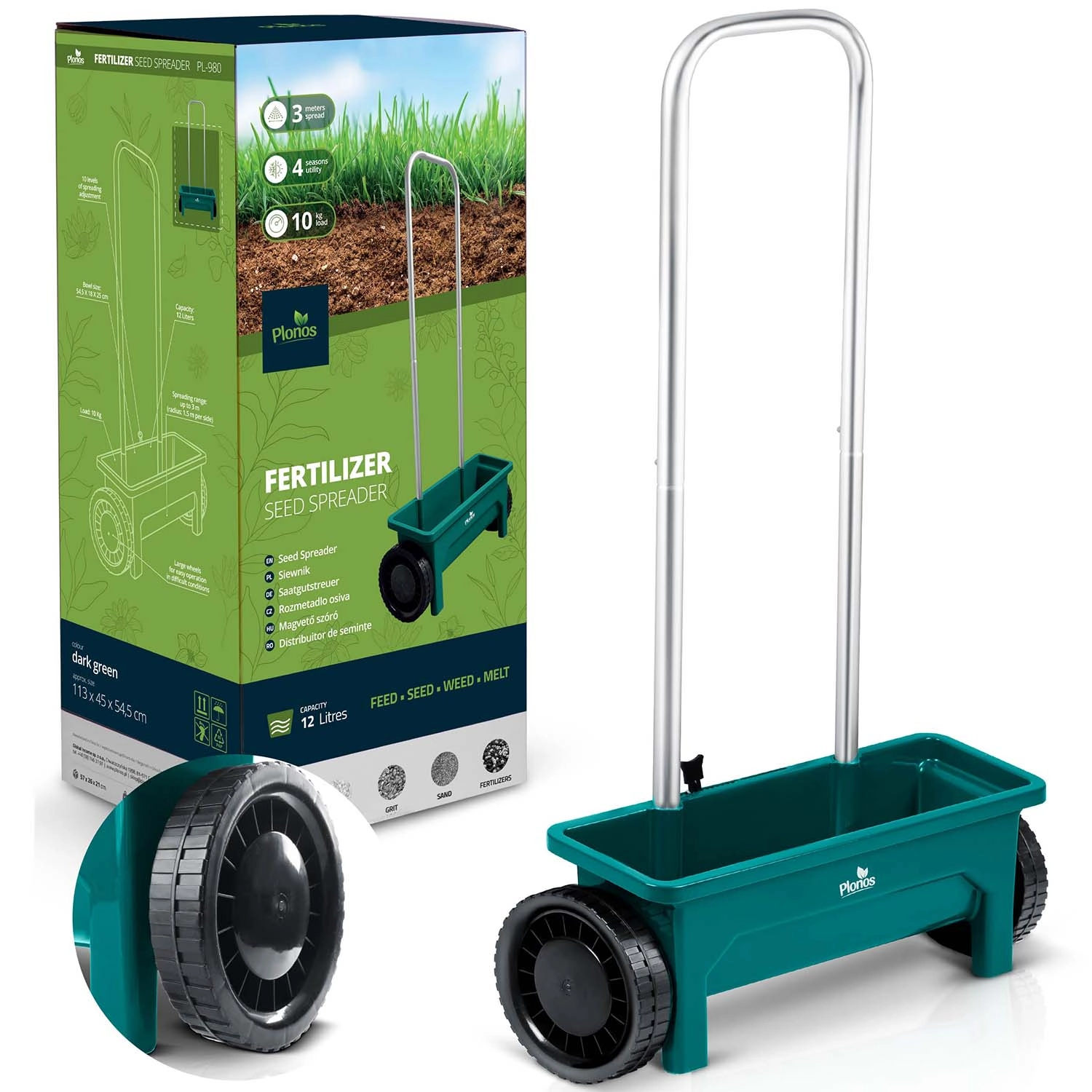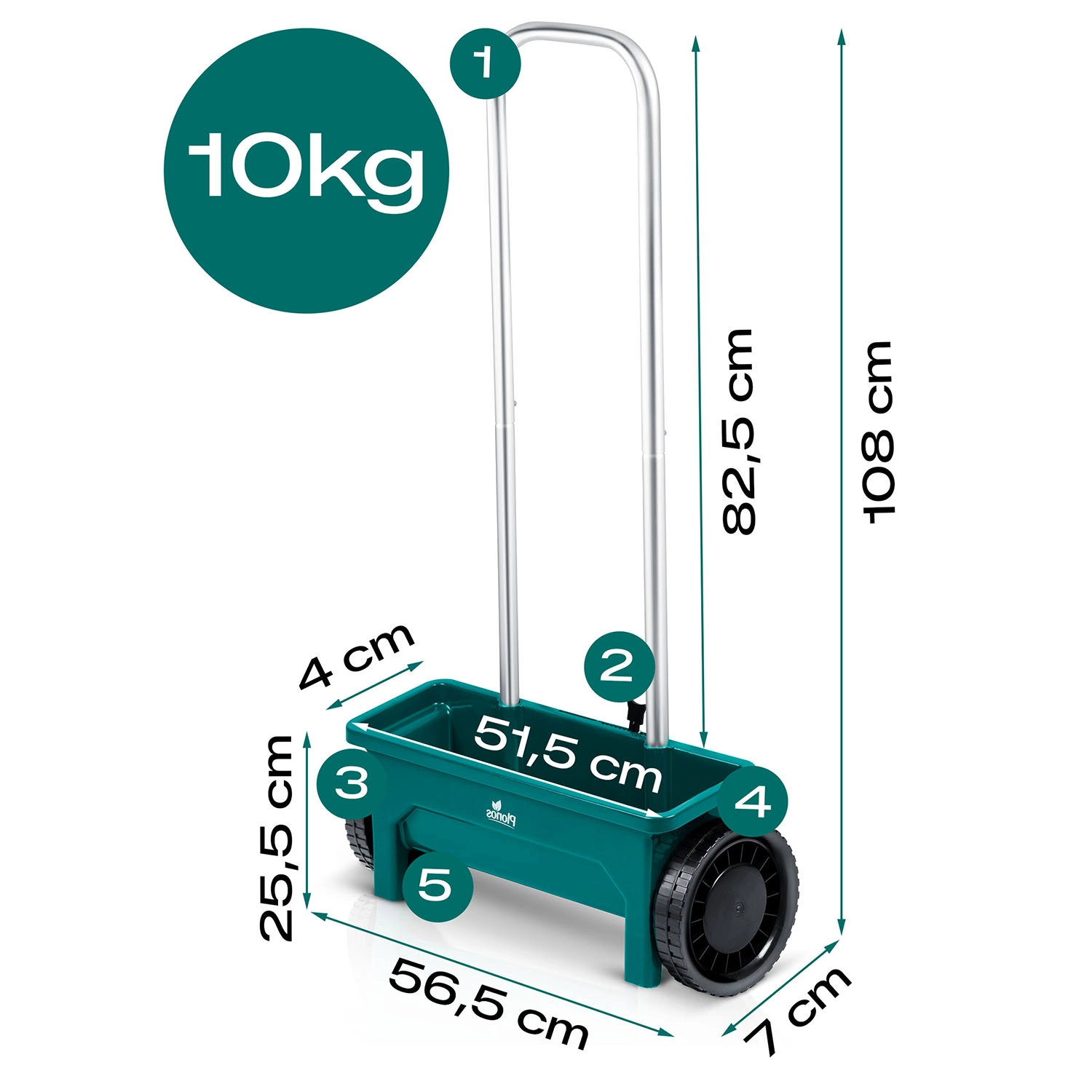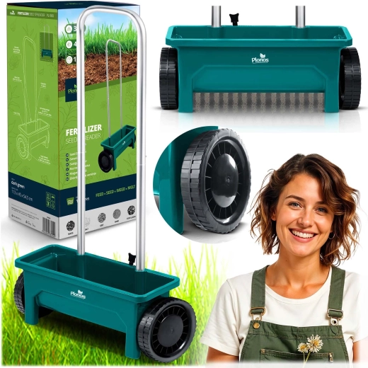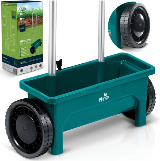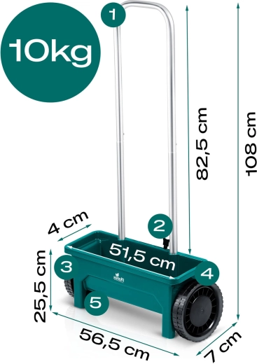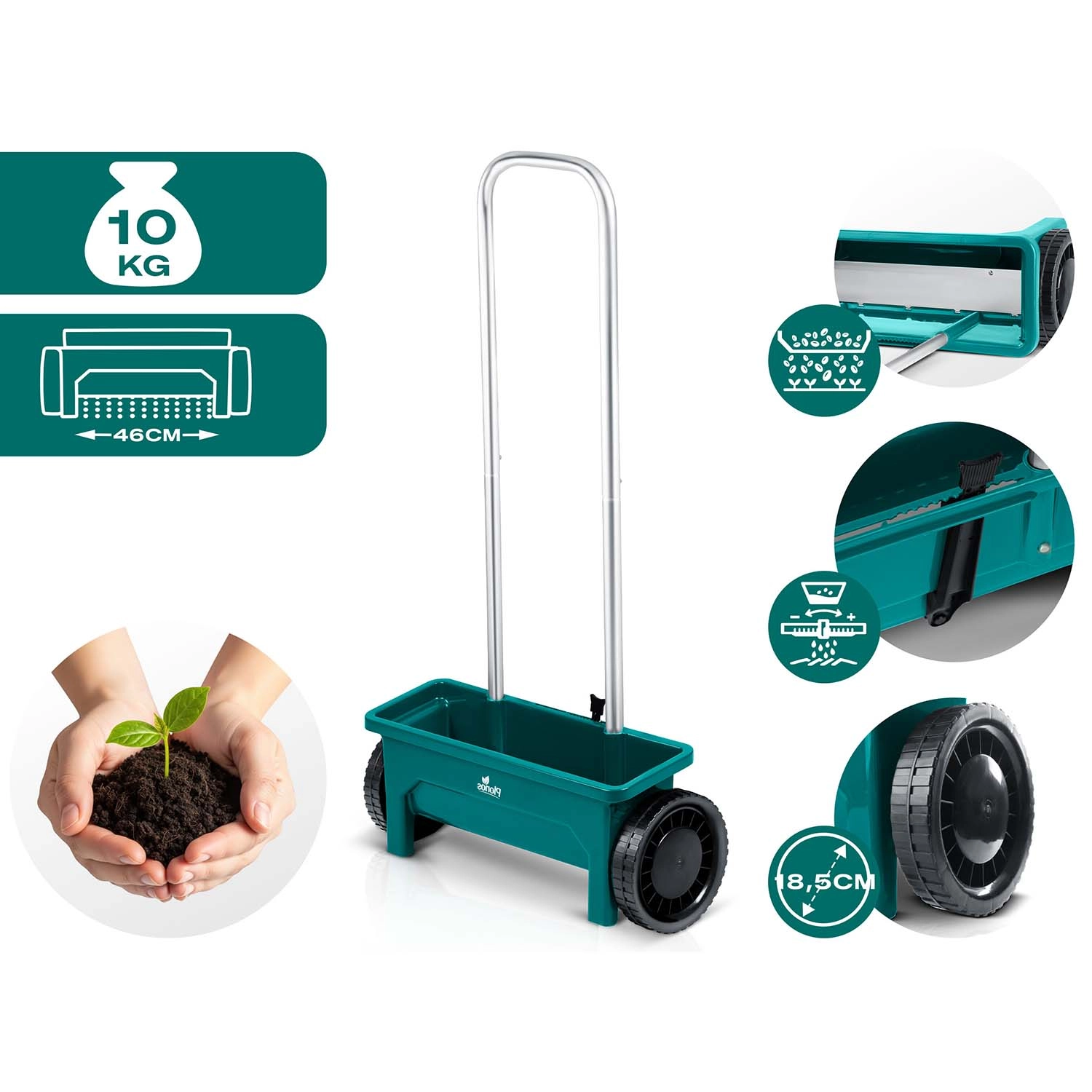 De duurzame kunststof trechter is gemakkelijk te reinigen en de grote wielen zorgen voor een soepele loop ook op oneffen terrein. De ergonomische handgreep vermindert vermoeidheid bij langer werken en de handmatige aandrijving garandeert eenvoudige, directe inzetbaarheid zonder complex onderhoud.