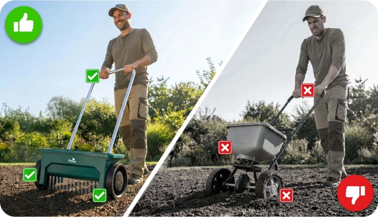 Stabiel en eenvoudig te manoeuvreren op gazon en harde ondergronden. De strooier houdt koers en de spreiding blijft consistent.