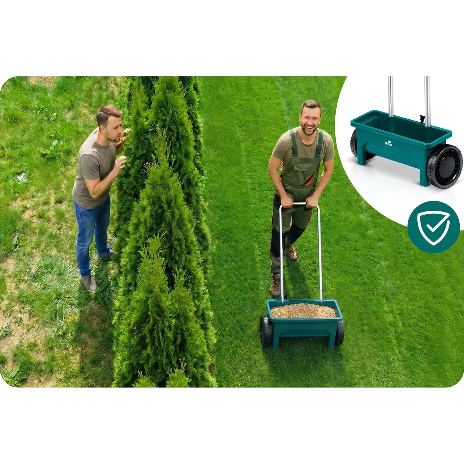 Zaaien en bemesten in het seizoen; in de winter zout en zand voor trottoirs en opritten. Eén hulpmiddel voor het hele jaar.