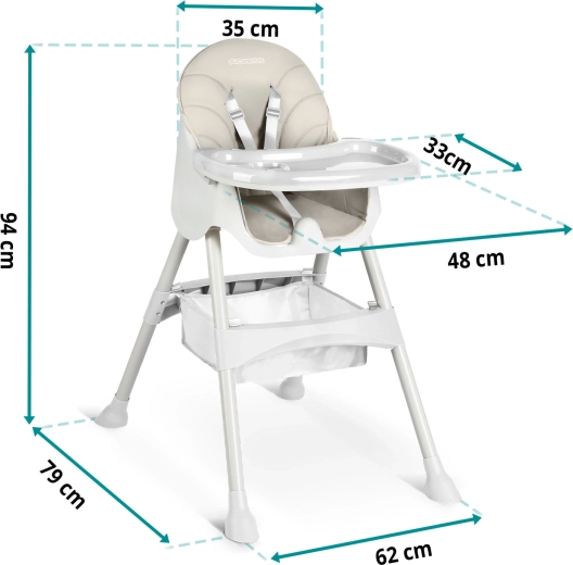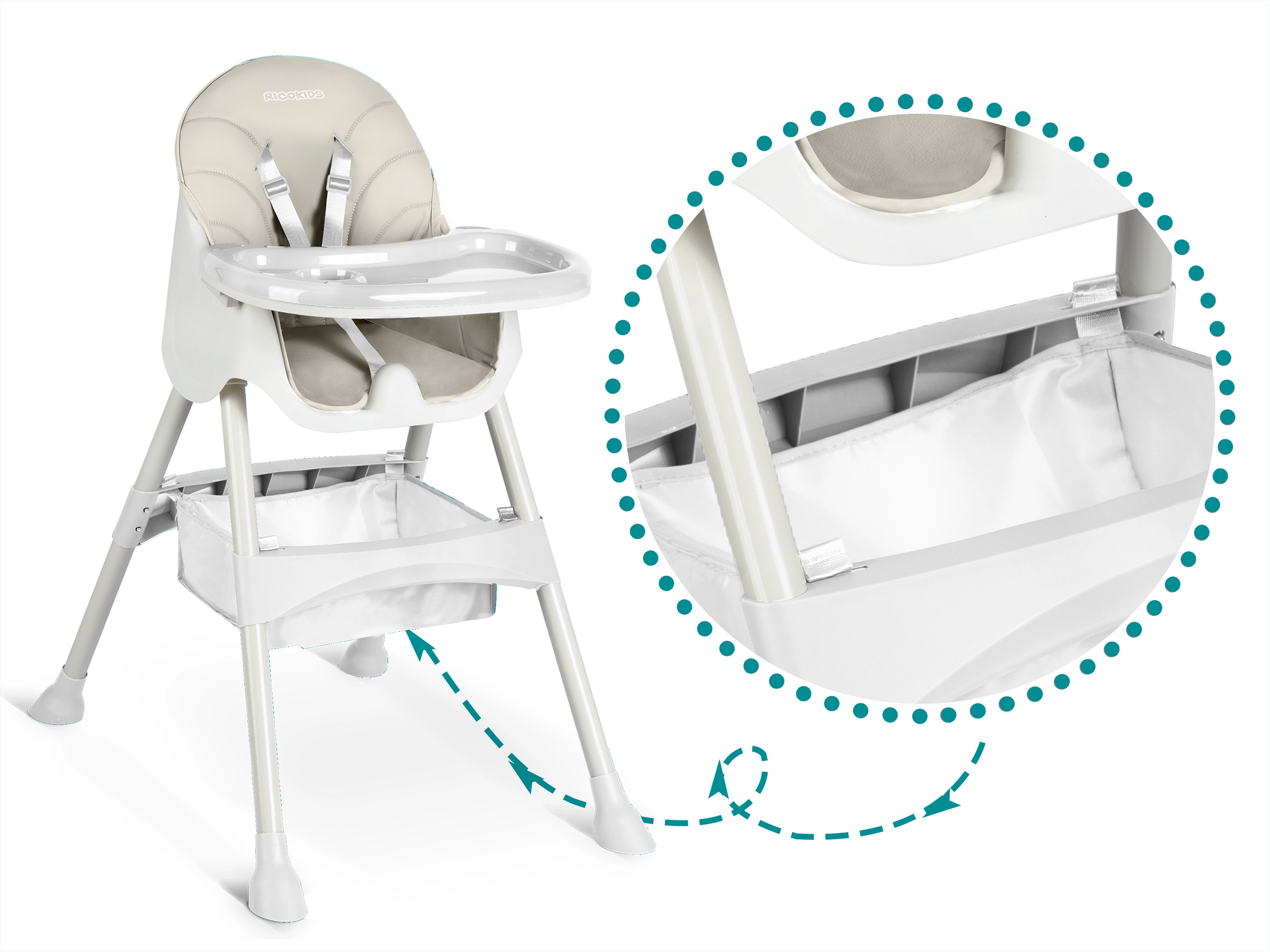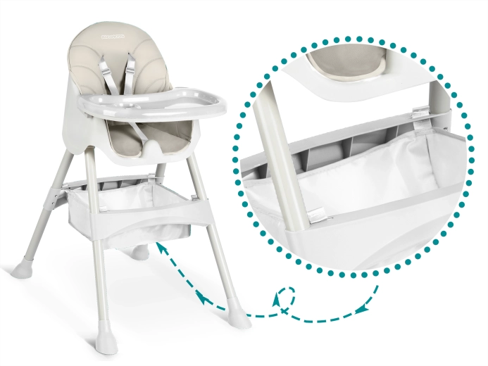 De veiligheid wordt gewaarborgd door betrouwbare 5-puntsgordels en brede antislipvoeten met rubberen doppen voor stabiliteit op verschillende ondergronden. Het praktische vouwen maakt compacte opslag mogelijk, zodat de stoel minimale ruimte inneemt. In de set zit ook een duurzame mand onder de zitting, waarin je speelgoed of eetaccessoires kunt opbergen.