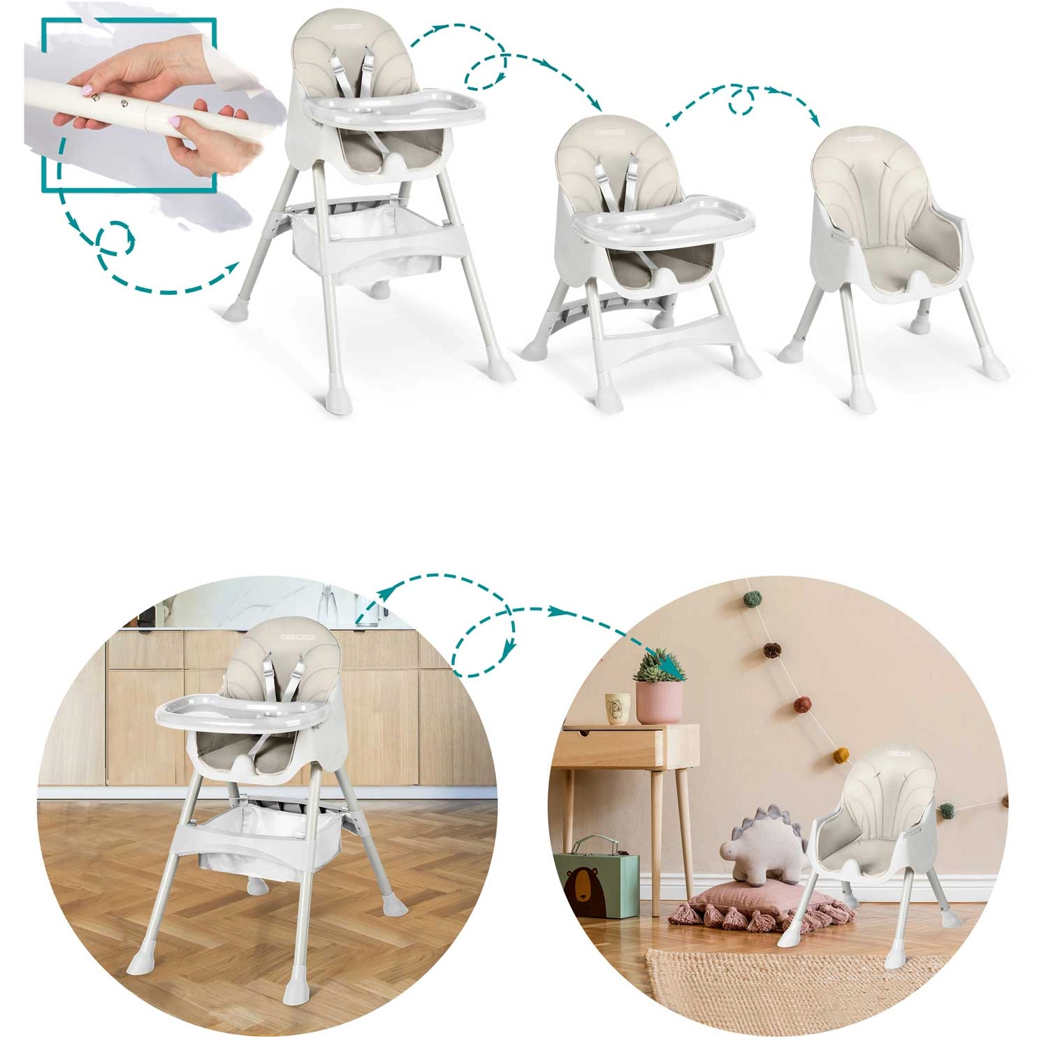 - Groeit mee met je kind (3-in-1): hoge stoel, booster/lager stoeltje.
