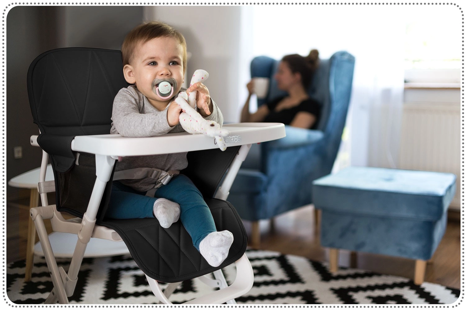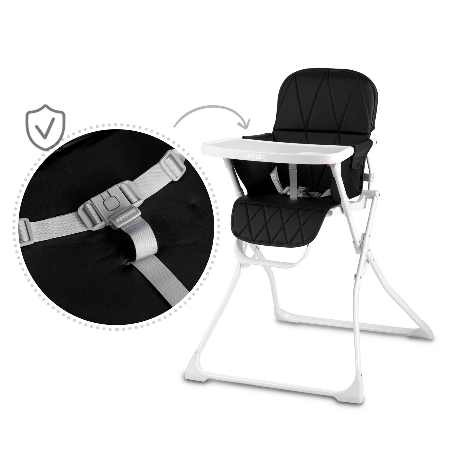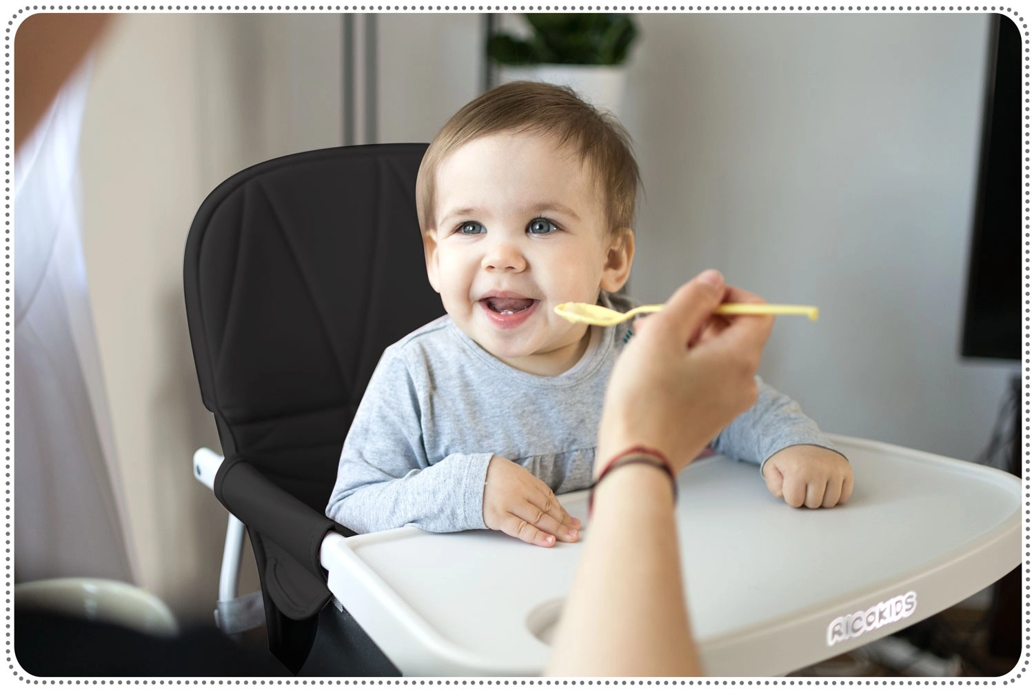 Het RICOKIDS Nuco stoeltje combineert modern, minimalistisch design met functionaliteit voor dagelijks voeden. Het blad met opstaande randen en een aparte plek voor een bekertje voorkomt knoeien, terwijl de gewatteerde, doorgestikte bekleding maximaal comfort biedt. Materialen zijn eenvoudig te onderhouden – het blad kan worden verwijderd en onder stromend water worden afgespoeld, de bekleding is af te nemen met een doek.