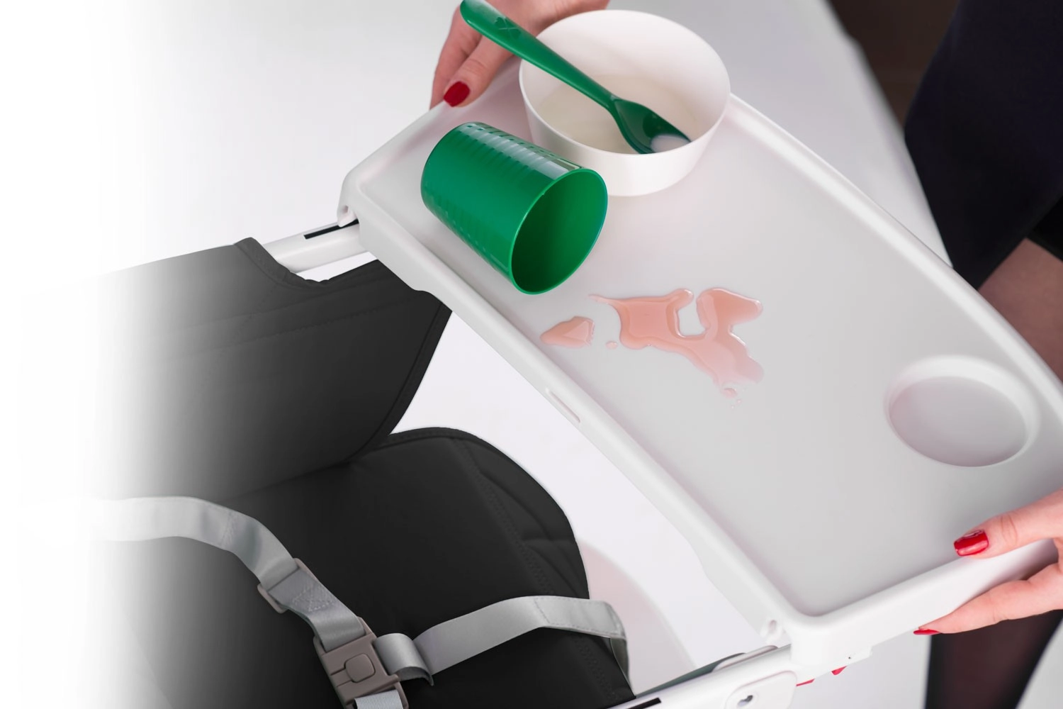 Het afneembare blad met plek voor een bekertje voorkomt dat vloeistoffen weglopen en maakt schoonmaken eenvoudig. Haal het eraf en spoel het af onder de kraan.