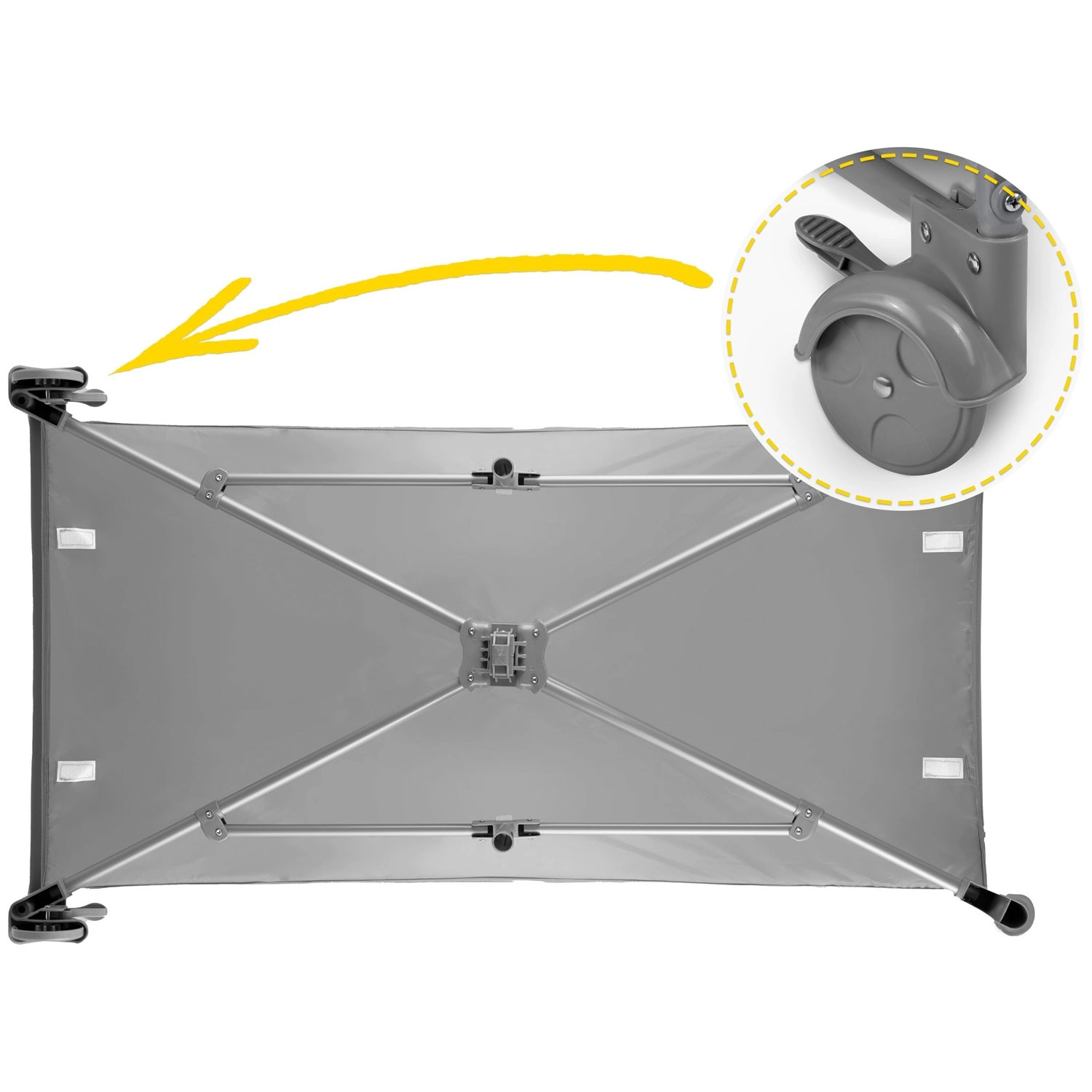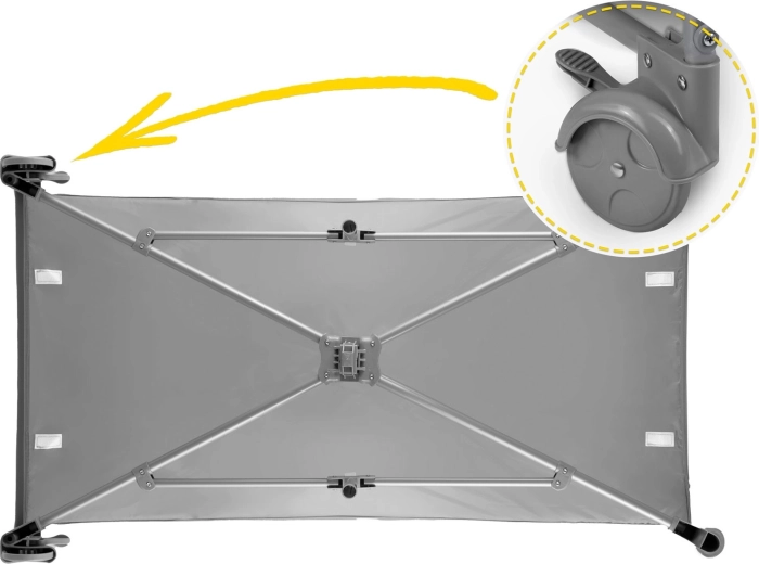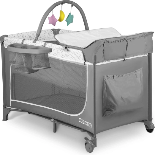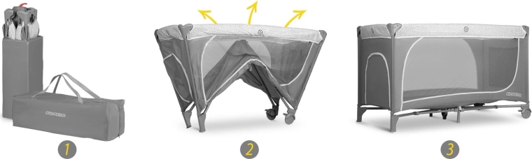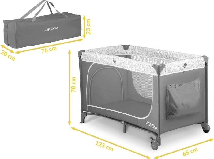 In de set zitten een opvouwbaar matras, verschoontafel, boog met speeltjes, praktische organizer en vak en een draagtas. Wieltjes met rem maken eenvoudig verplaatsen in huis mogelijk en zorgen voor stabiele vergrendeling op zijn plek. De duurzame constructie zonder scherpe randen en een vergrendeling tegen per ongeluk inklappen verhogen de veiligheid. Het bedje is snel op- en uit te klappen – ideaal voor reizen, bezoekjes en dagelijks gebruik.