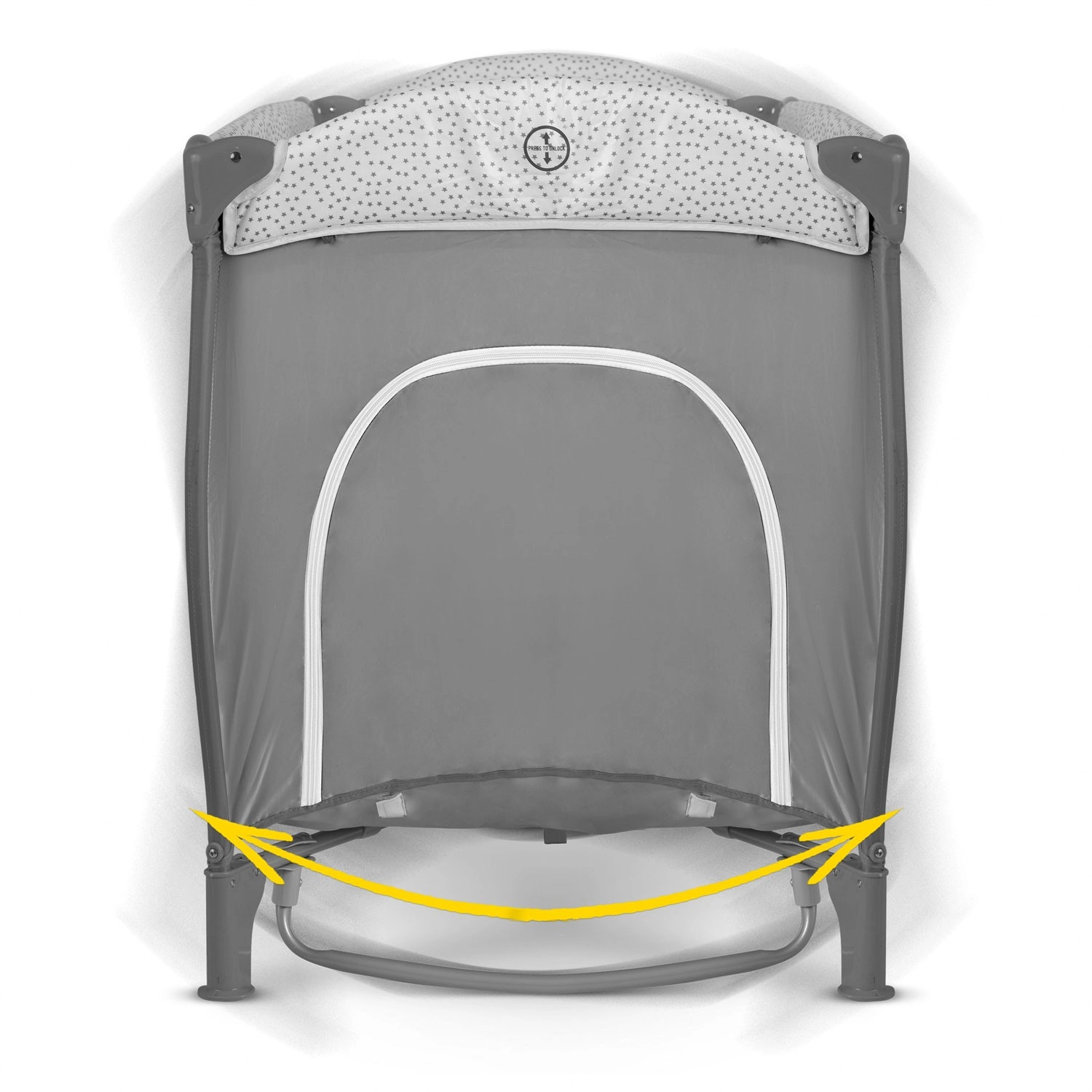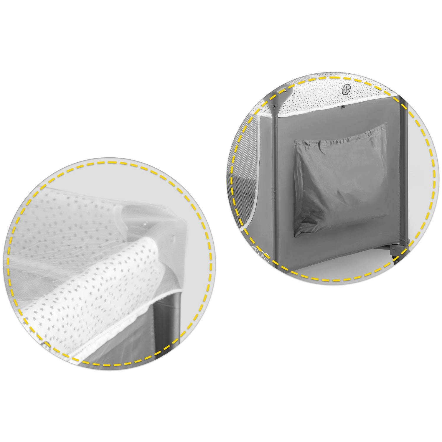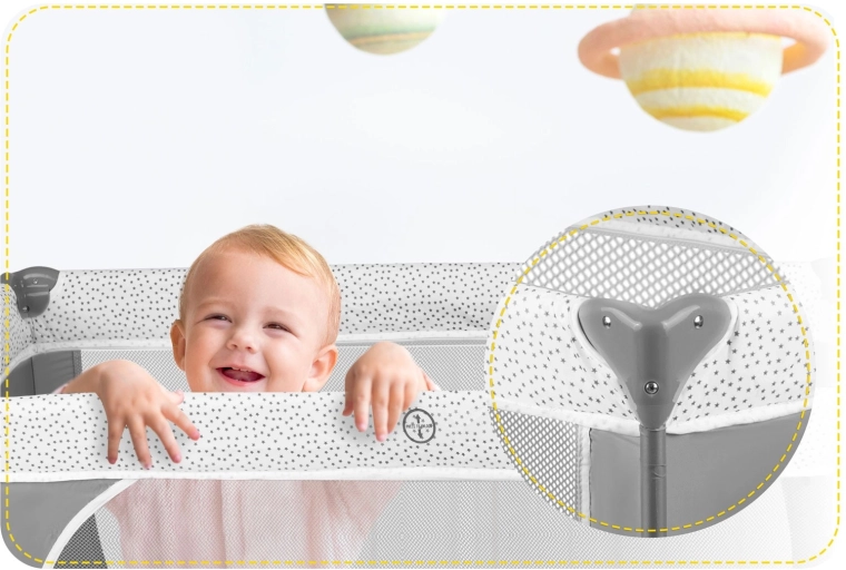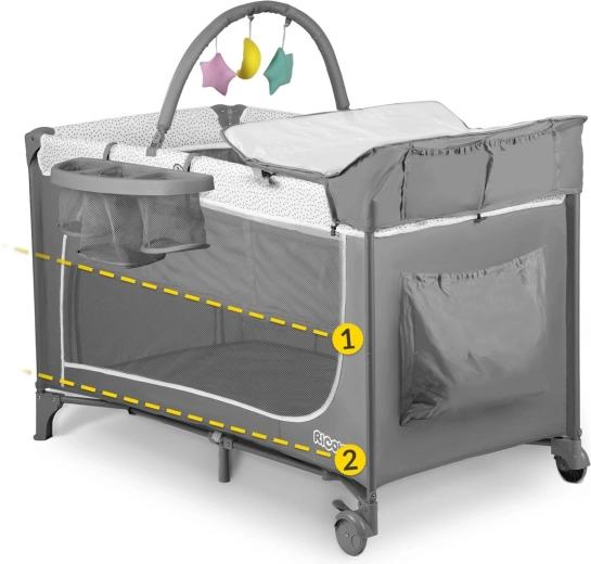 Het reisbedje in elegant grijs is ontworpen voor maximaal comfort en veiligheid voor het kind en gemak voor de ouders. Dankzij twee hoogtestanden van de lattenbodem pas je het eenvoudig aan de leeftijd en behoeften van de baby aan. De zij-ingang met rits vergemakkelijkt zelfstandig kruipen bij oudere kinderen, terwijl de ademende gaaszijdes zorgen voor uitstekende luchtcirculatie en overzicht.