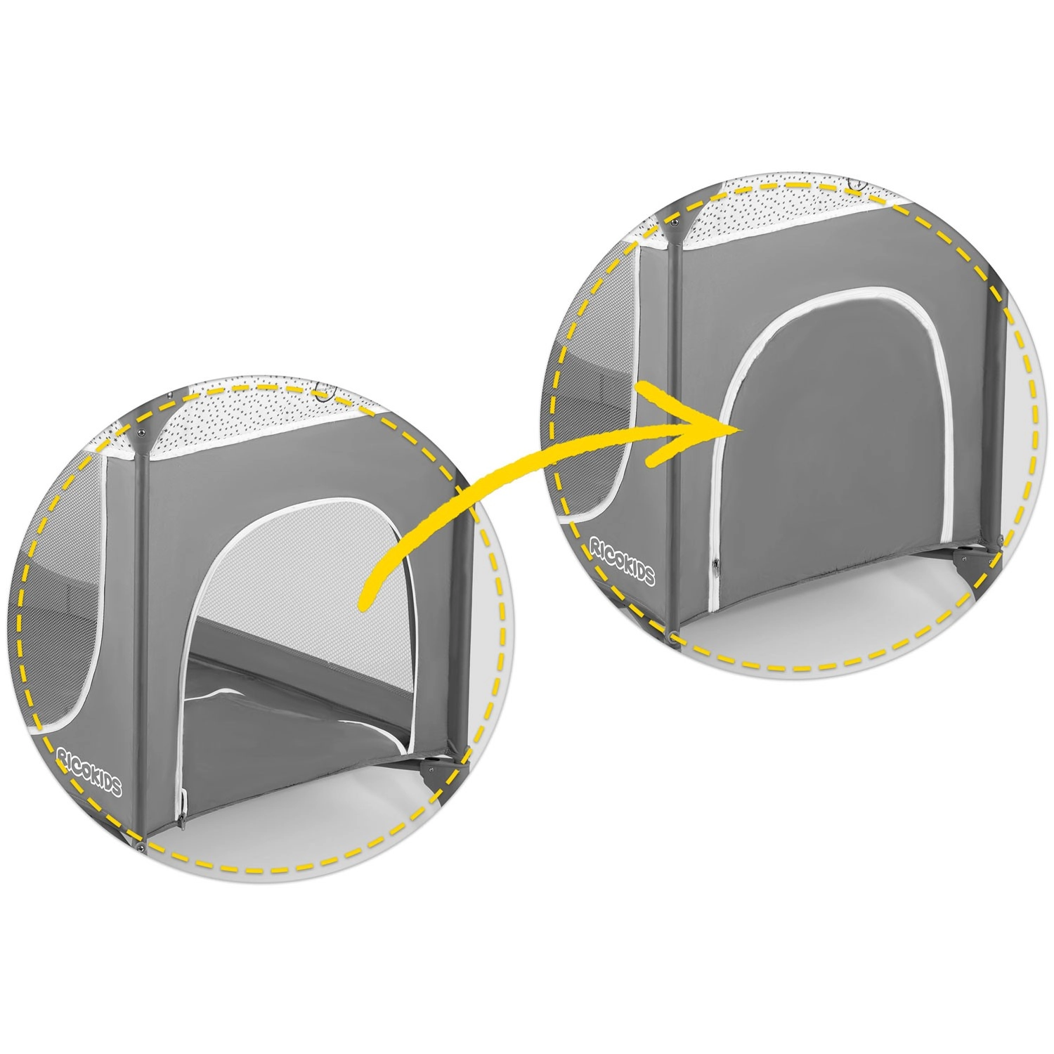 De geritste zijopening maakt zelfstandig in- en uitstappen voor oudere kinderen makkelijker. Gaaswanden zorgen voor luchtcirculatie en constant zicht.