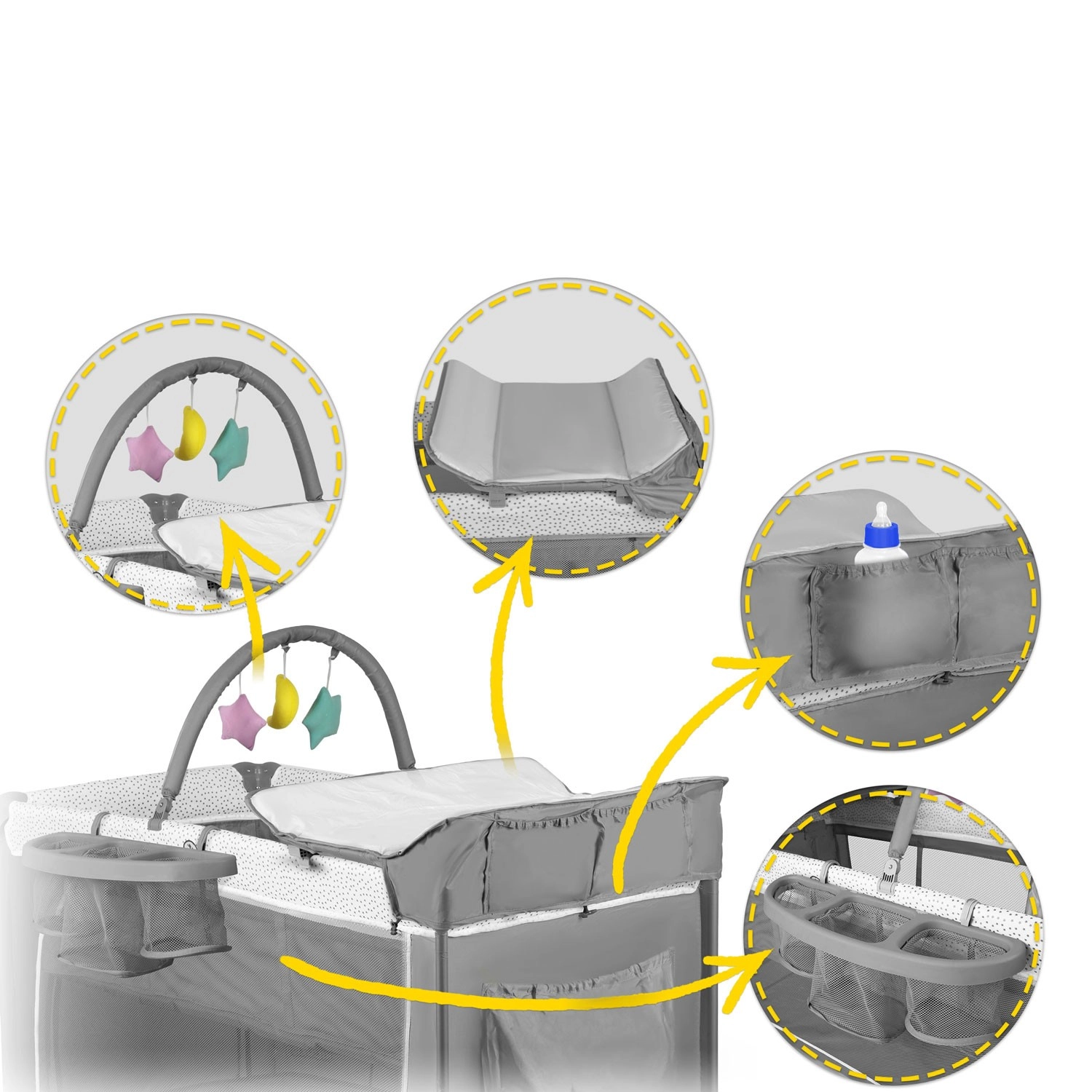 Compleet uitgerust: verschoningsunit, boog met speeltjes, zijvakken en organizer voor luiers en flesjes. Inclusief opvouwbaar matras en draagtas.