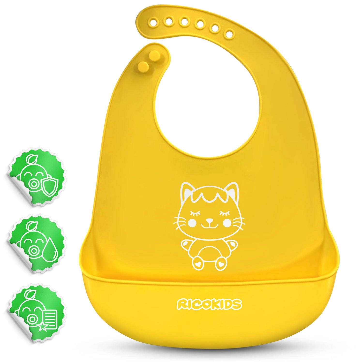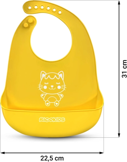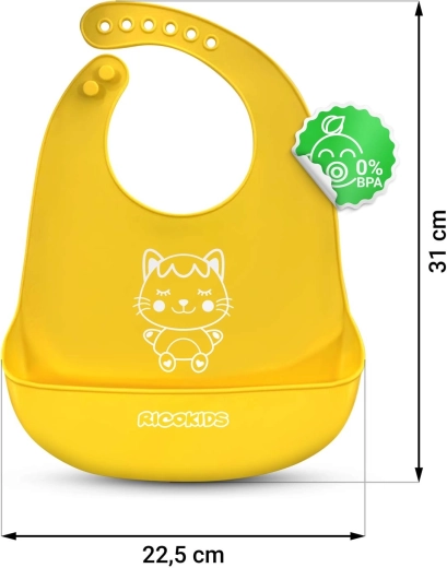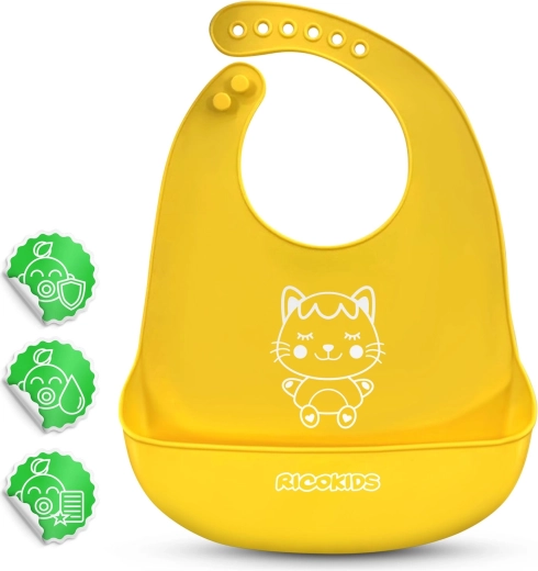 De praktische siliconen slab van Ricokids in het geel is de ideale hulp bij het voeden. Hij is licht, waterdicht en duurzaam, gemaakt van een prettig materiaal met een diepe opvangzak voor kruimels. Dankzij de 7-traps verstelling groeit hij mee met het kind en de BPA-vrije samenstelling garandeert veilig gebruik.