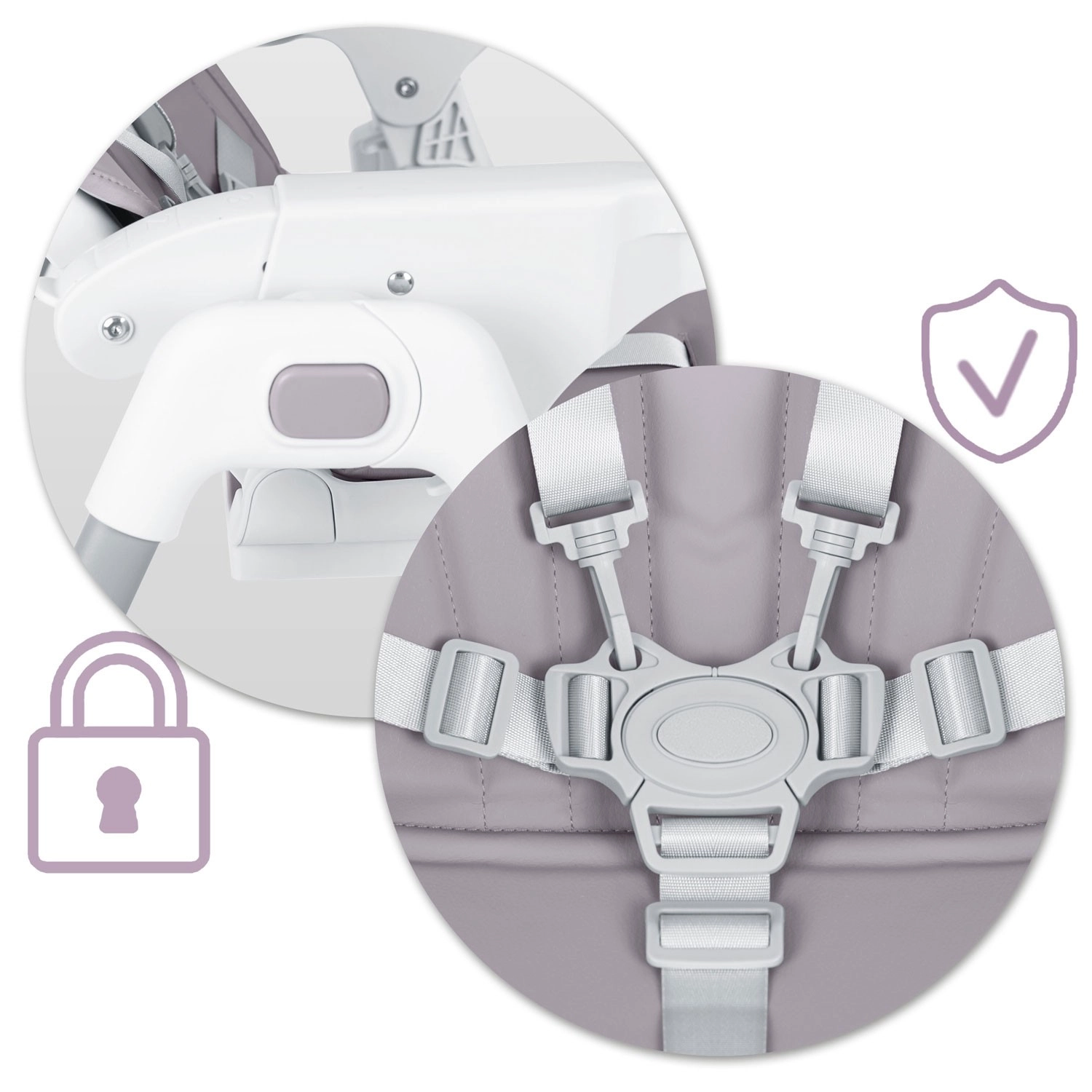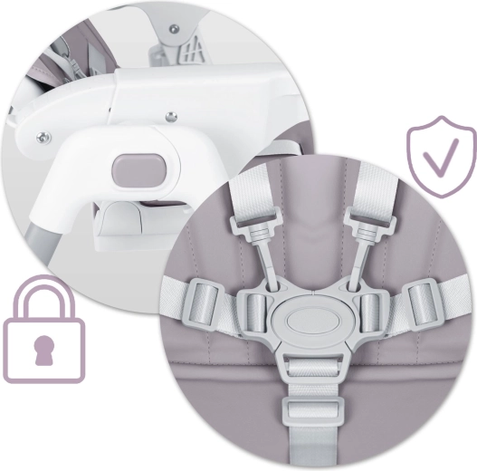 Vijfpuntsgordels en een stabiel frame zorgen voor veilig zitten tijdens eten en spelen. De instellingen en vergrendelingen zijn eenvoudig toegankelijk en betrouwbaar.