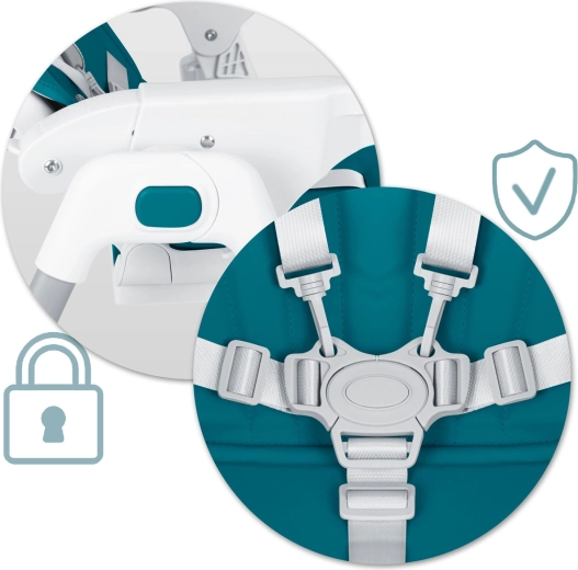 De vijfpuntsgordel met centrale gesp en de brede basis houden je kind veilig tijdens het eten en spelen. Voldoet aan de Europese norm EN 14988.