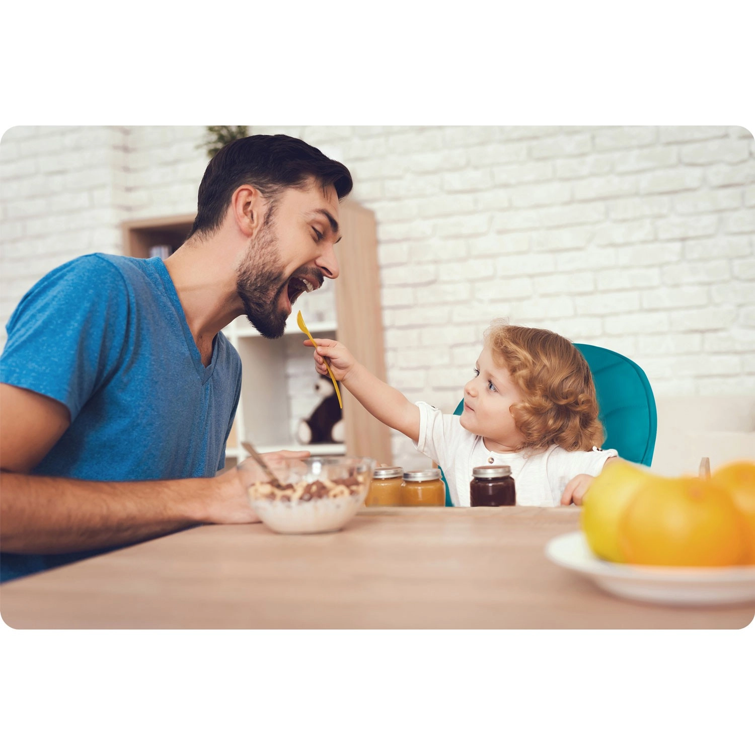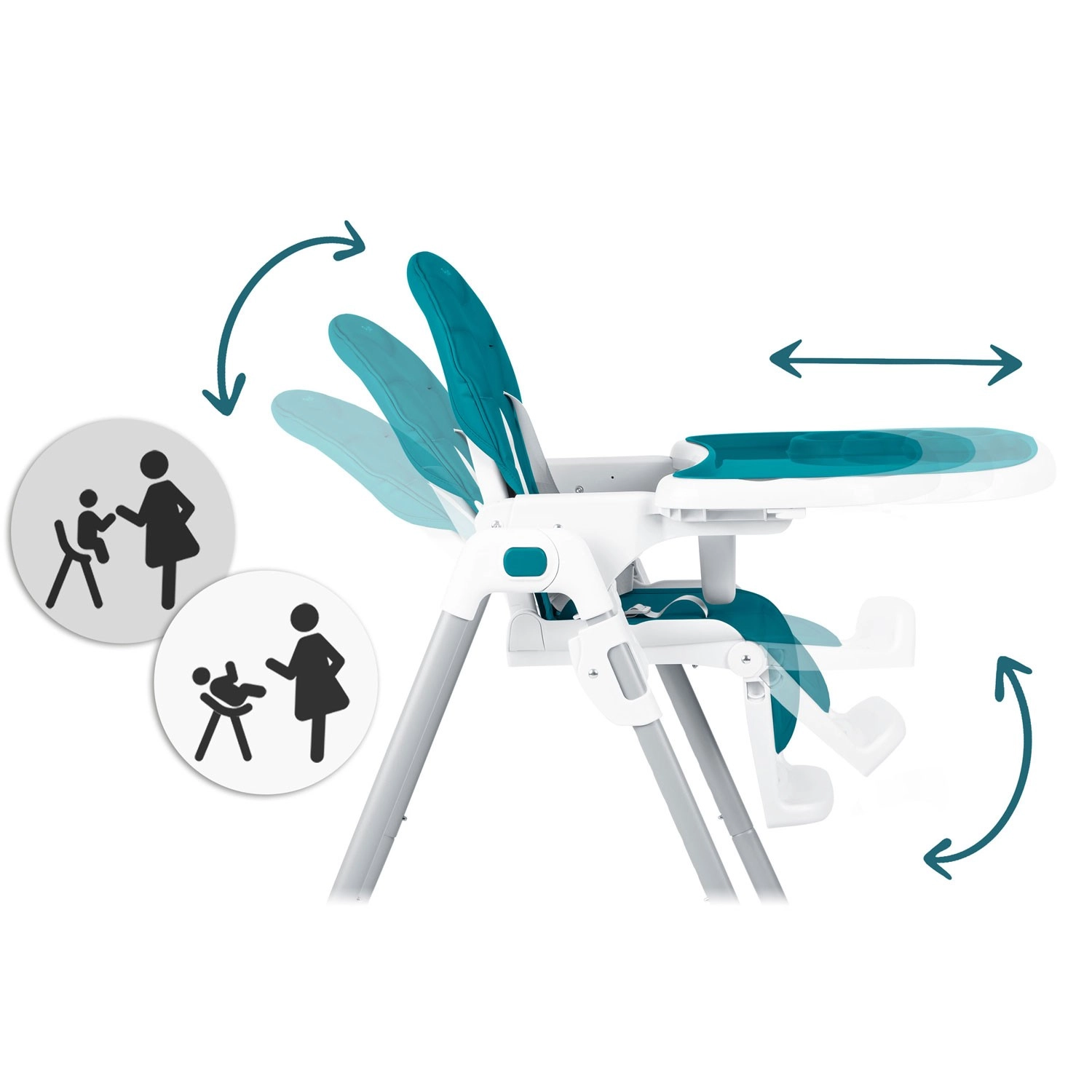 Het uitneembare dubbele blad met verhoogde randen voorkomt morsen en kan gemakkelijk onder stromend water of in de vaatwasser worden gereinigd. De verstelbare afstand van het blad, de zithoogte en de voetensteun helpen bij het instellen van een ergonomische en comfortabele zithouding voor peuters en grotere kinderen tot 15 kg. Achterwieltjes vergemakkelijken het verplaatsen in huis.