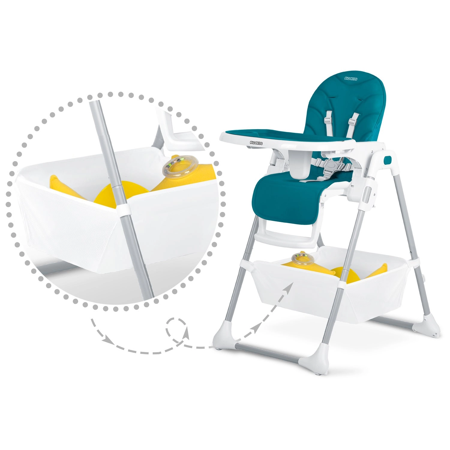Ricokids Tulo groeit met je kind mee: van de eerste hapjes tot zelfstandig aan tafel zitten. De robuuste constructie met stabiele basis en vijfpuntsgordel zorgt voor veiligheid, terwijl de zachte, onderhoudsvriendelijke bekleding en afneembare, afwasbare oppervlakken het schoonmaken na elke maaltijd vereenvoudigen. Dankzij het compacte inklappen berg je de stoel snel op wanneer je hem even niet gebruikt.