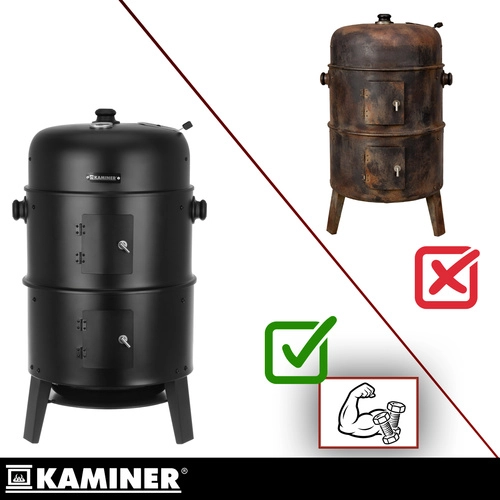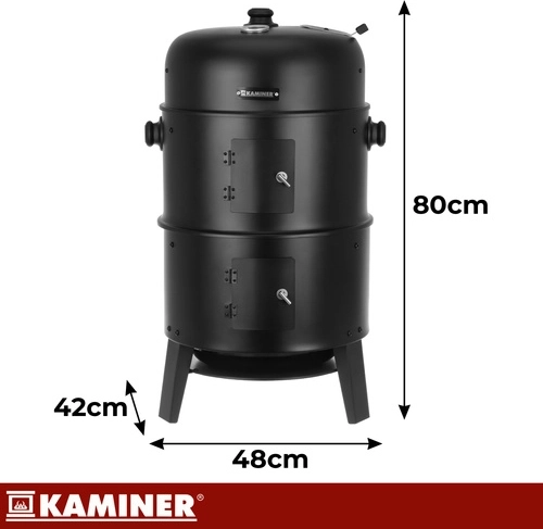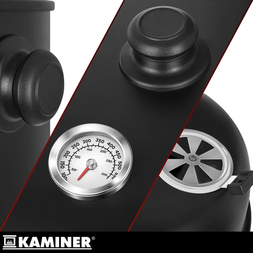 Ontdek de veelzijdige KAMINER 3-in-1 grill, die grillen, roken en vuurkorf in één combineert. Dankzij de thermometer in het deksel, luchttoevoerregeling en twee verchroomde roosters van 38 cm bereid je sappige steaks en geurige vleeswaren met minimale inspanning. 8 rookhaken, een duurzame stalen constructie van 0,9 mm en eenvoudige reiniging maken het de ideale keuze voor elke BBQ.