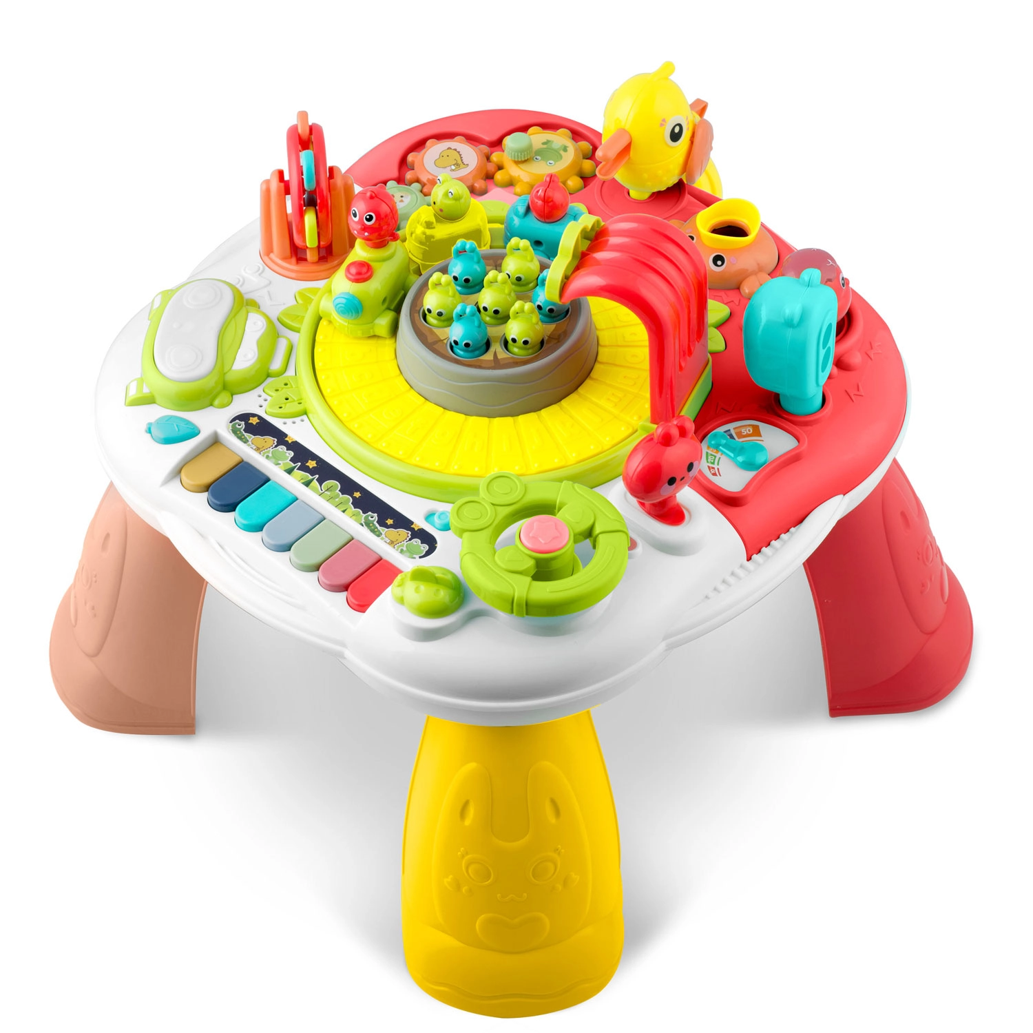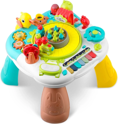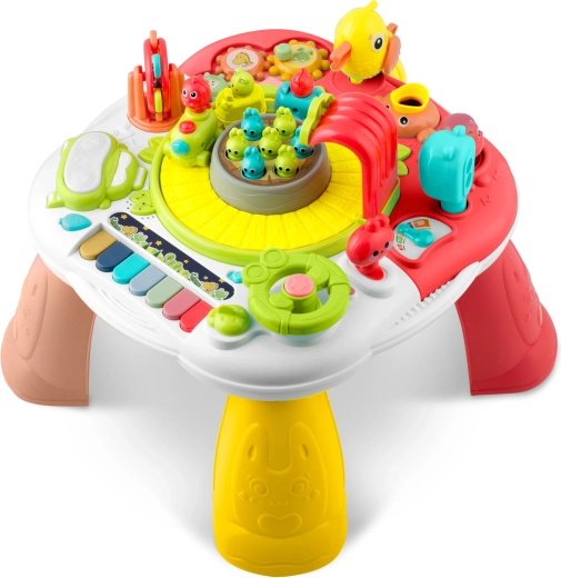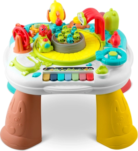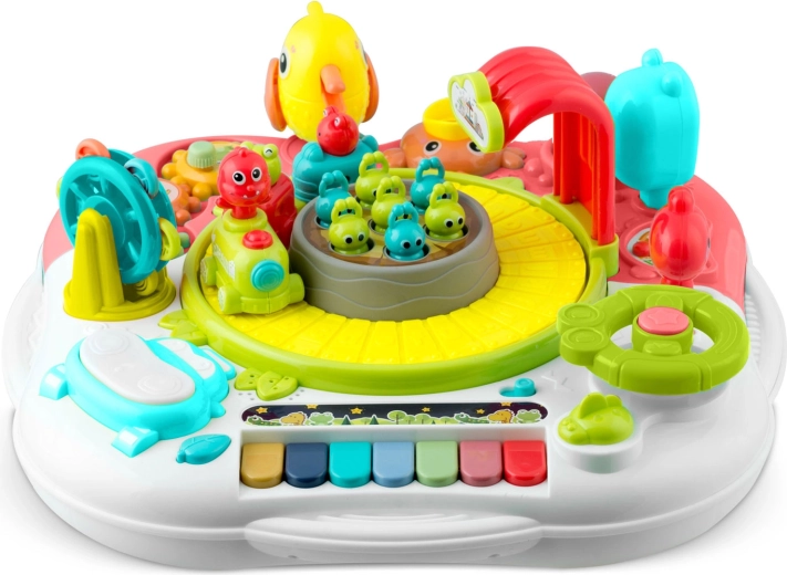 Een leuke en slimme metgezel voor kinderen vanaf 18 maanden: de interactieve tafel met afneembaar paneel dient ook als educatief bord. Biedt licht- en geluidselementen, een kleurrijk pianootje, een automatische trein, een draaicarrousel, tandwielen en een hele reeks knoppen en hendels voor de ontwikkeling van fijne motoriek, logica en het leren van kleuren. De stabiele constructie, snelle montage en twee standen voor volumeregeling maken zowel kinderen als ouders blij.