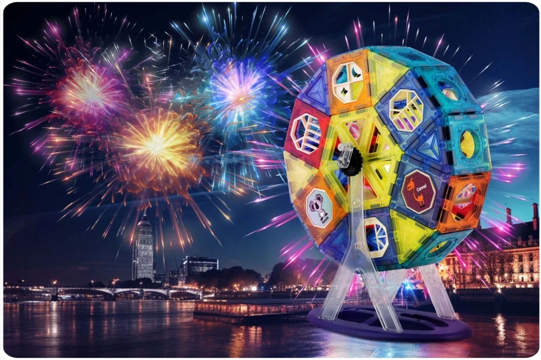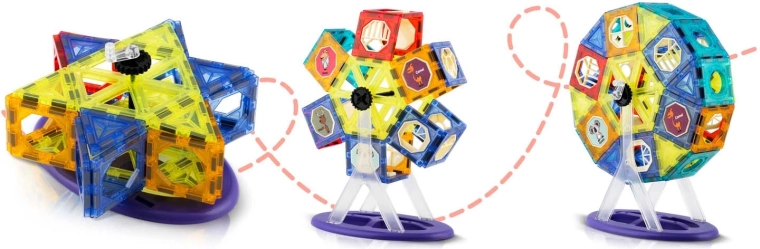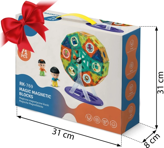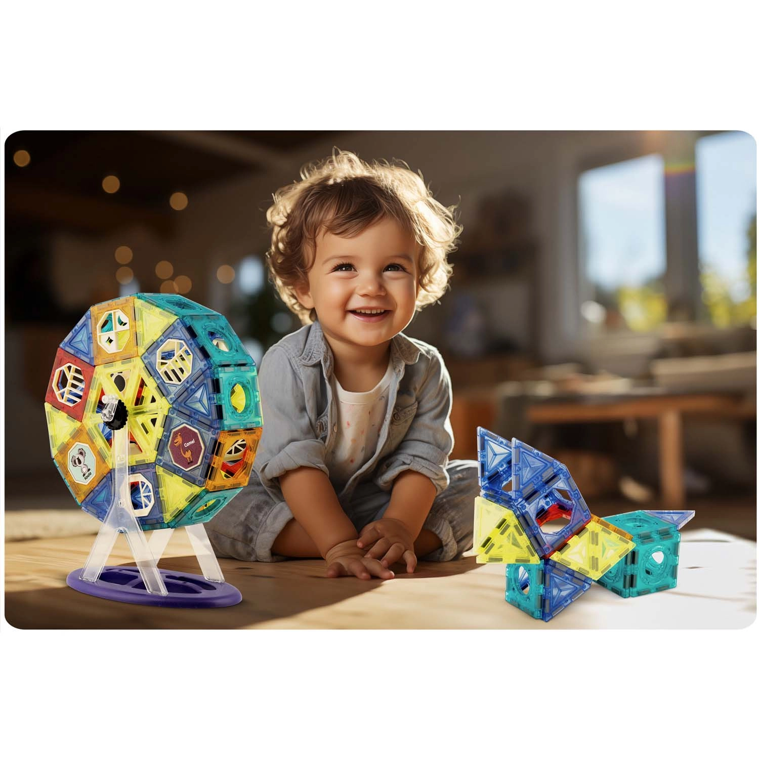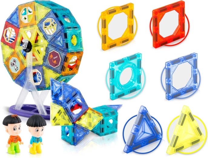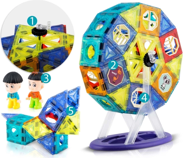 Ontdek de creatieve wereld van de magnetische bouwsets van RICOKIDS met een draaibaar reuzenrad! Deze uitgebreide set biedt meer dan 70 onderdelen, transparante, kleurrijke vormen en een bewegend reuzenrad op een stabiele basis. Kinderen trainen hun fijne motoriek, oog-handcoördinatie en ruimtelijk inzicht terwijl ze eindeloze combinaties bouwen. Inclusief figuurtjes, stickers en een mooie geschenkverpakking. Veilig en gecertificeerd leerzaam speelplezier voor jonge bouwers.