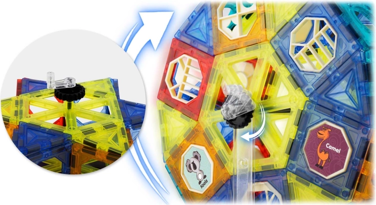 Dankzij de rijke set aan accessoires – kinderfiguurtjes, stickers en speciale onderdelen voor het wiel – ontwikkelen kinderen hun creativiteit, logisch denken en probleemoplossend vermogen. De set ondersteunt het begrip van concepten als symmetrie en rotatie, bevordert samenwerking bij samen spelen en is ideaal als cadeau.