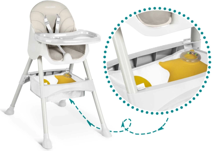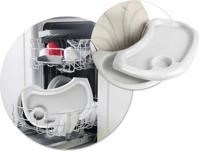 Veiligheid staat voorop: 5-punts gordels, antislip doppen op de poten en een constructie conform de Europese norm EN 14988 zorgen voor zekerheid tijdens eten en spelen. De zachte bekleding is gemaakt van materiaal dat geen vuil absorbeert – afnemen met een vochtige doek is voldoende. Inclusief opbergmand voor speelgoed en benodigdheden en een siliconen slab gratis.