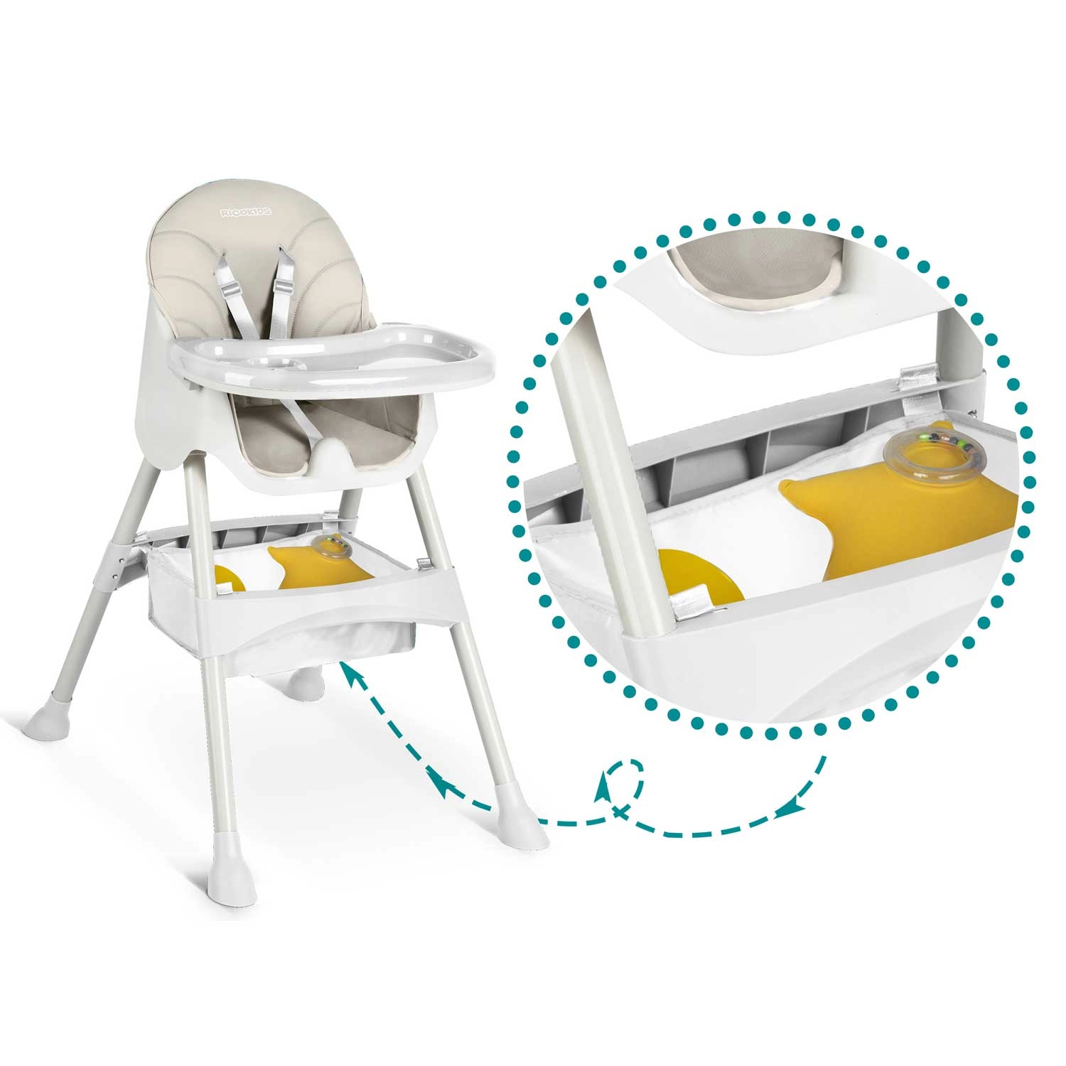 Stijlvolle en praktische kinder-eetstoel 3-in-1 RICOKIDS Milo groeit met je kind mee – van een hoge stoel tot een lage stoel. Biedt een afneembaar en verstelbaar blad met verhoogde randen, eenvoudige reiniging dankzij afwasbare materialen en een 5-punts veiligheidsgordel. Stabiliteit wordt gegarandeerd door antislip voetjes en in de set vind je bovendien een praktische siliconen slab en een opbergmand.