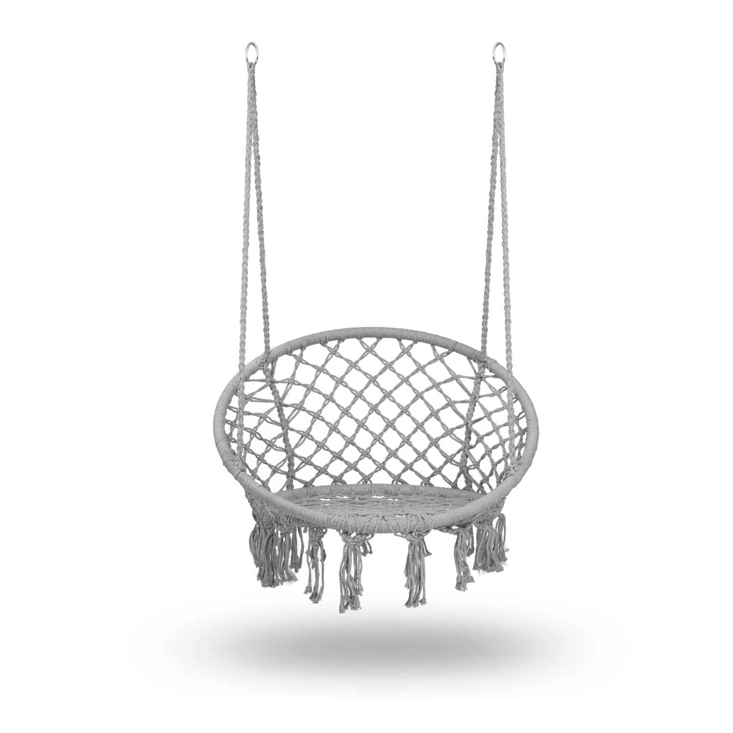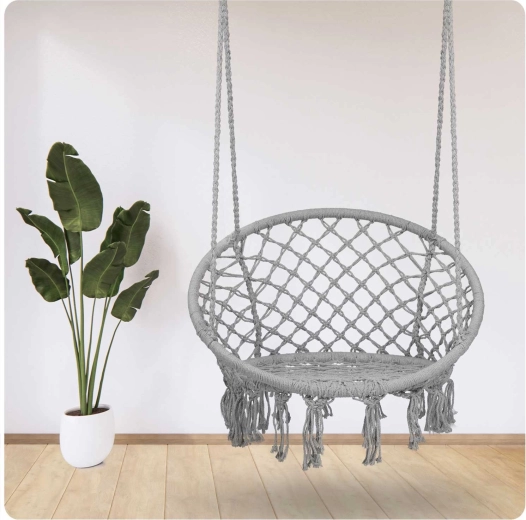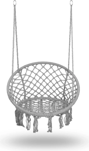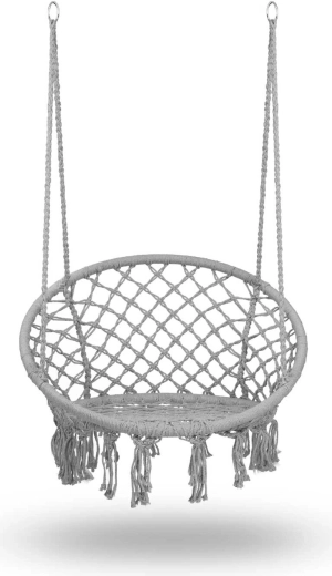 Geniet van ontspanning en comfort met deze stijlvolle hangstoel in boho design. Hij biedt een breed zitvlak, hoge rugleuning, stevige macramé-bespanning en een draagvermogen tot 150 kg. Dankzij de metalen ringen en dubbele touwen hang je hem eenvoudig aan één of twee punten op – in de woonkamer, op het balkon, het terras of in de tuin.