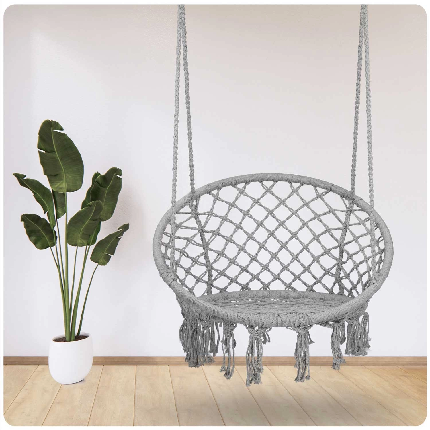Dubbel gevlochten touwen, metalen ringen en duurzame frame-ringen zorgen voor stabiliteit en een draagvermogen tot 150 kg – voor zorgeloos schommelen binnen en buiten.