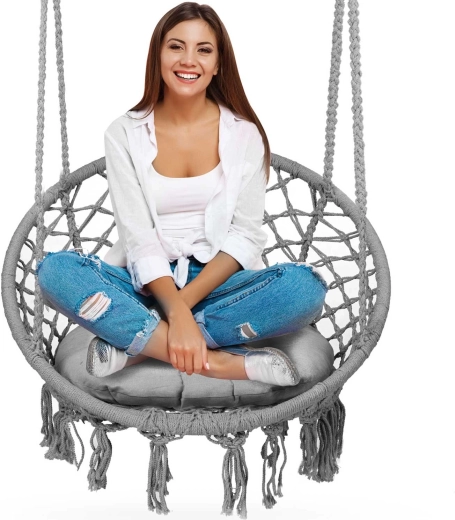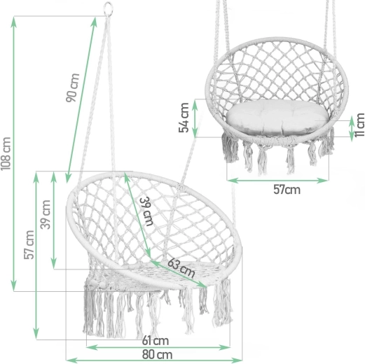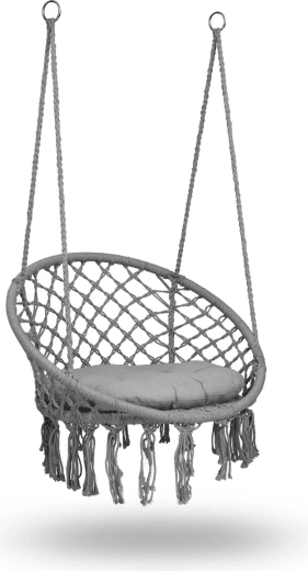 Geniet van relaxen in een hangstoel in boho-stijl met een brede zitting, hoge rugleuning en een zacht kussen inbegrepen. De duurzame metalen constructie, stevige macramé-bespanning en dubbele ophangtouwen zorgen voor veilig schommelen, zowel binnen als buiten. Draagvermogen tot 150 kg en de mogelijkheid tot montage aan één of twee ophangpunten maken deze stoel ideaal voor balkon, terras en woonkamer.