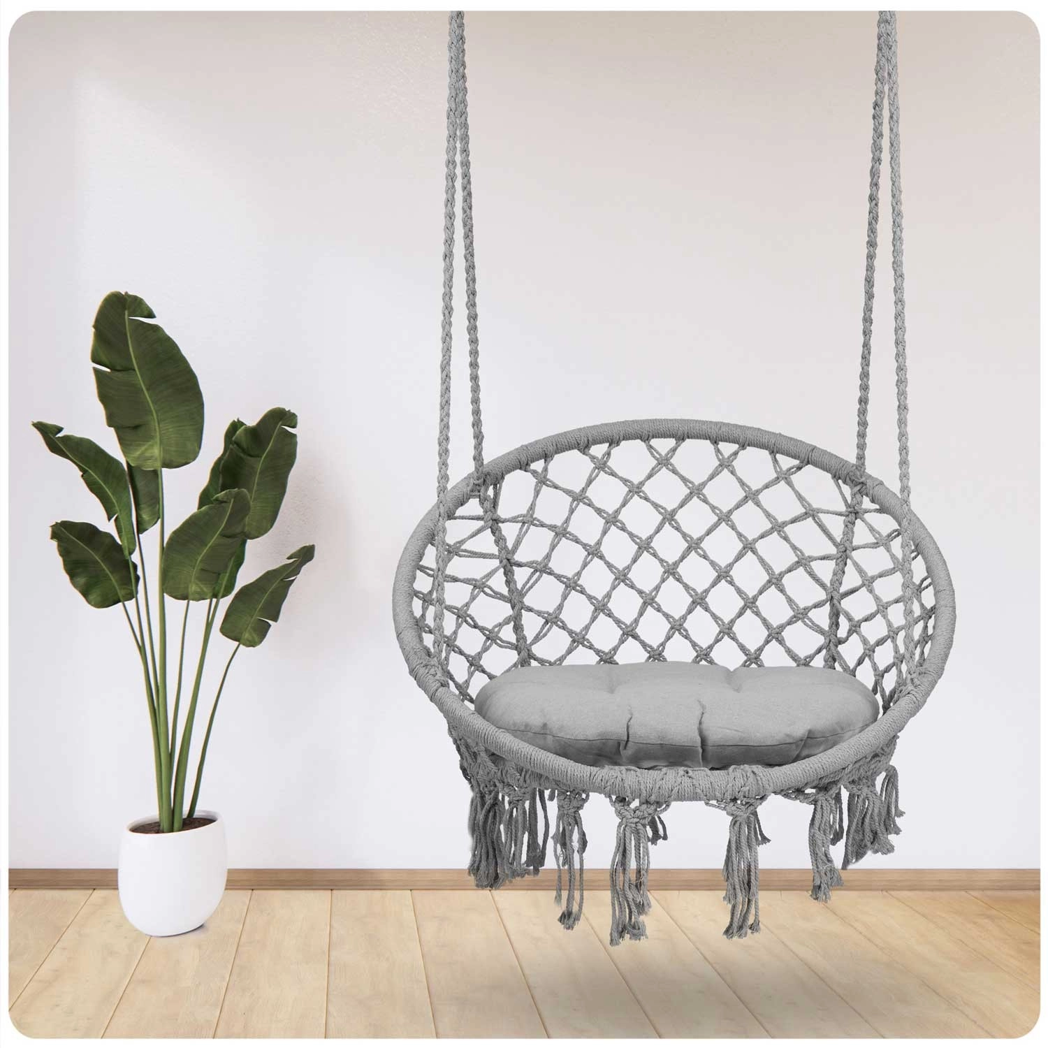 Metalen ringen, een dichte macramé-bespanning en dubbel gevlochten touwen zorgen voor stabiliteit, duurzaamheid en een draagvermogen tot 150 kg.