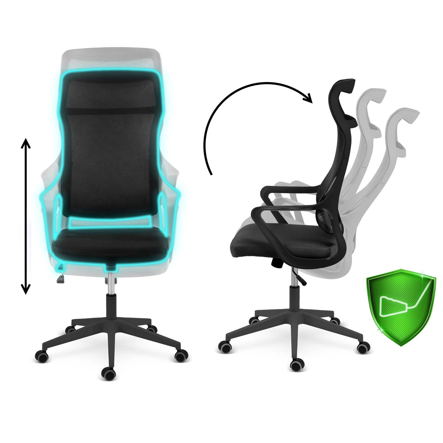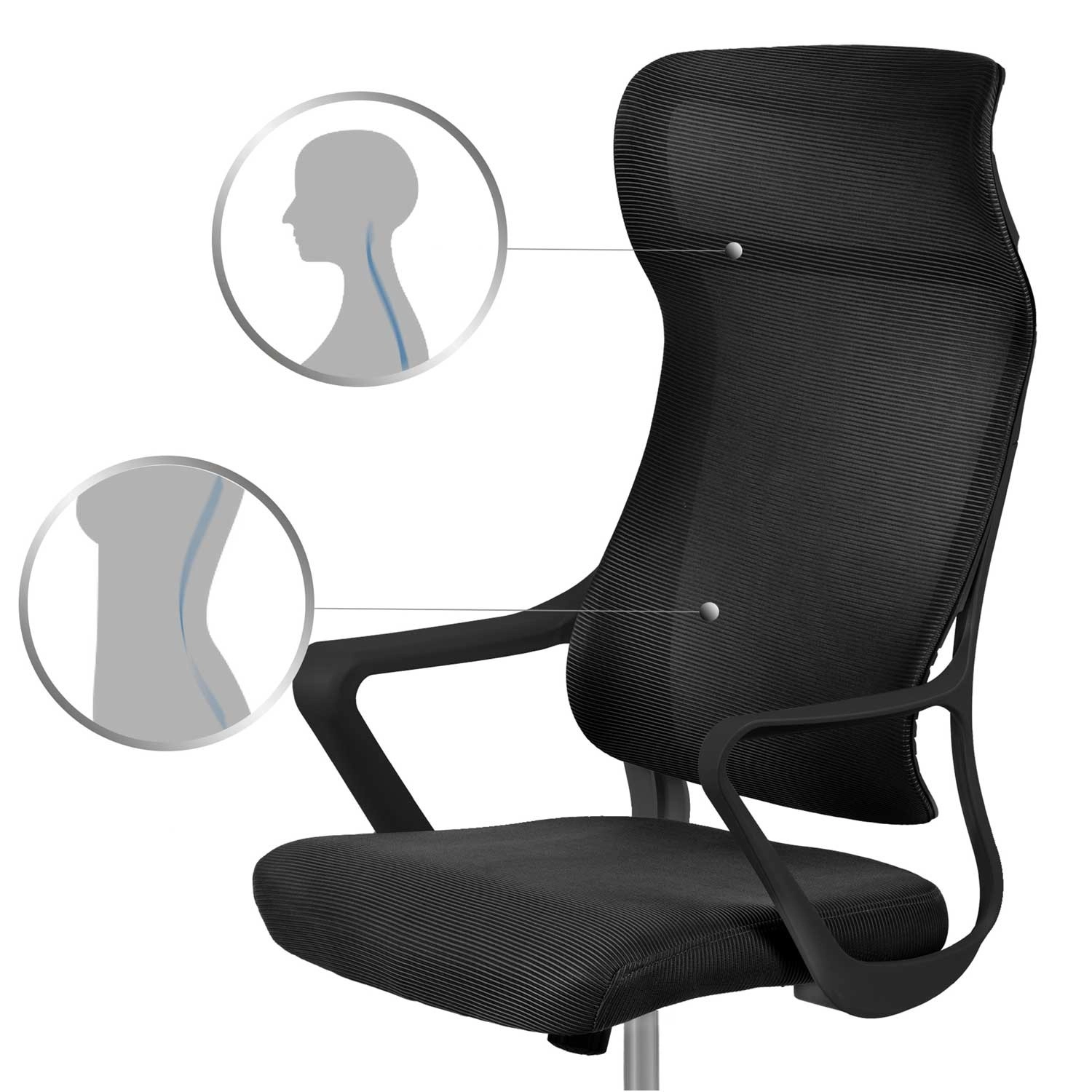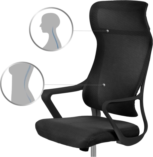 De hoge rugleuning van microgaas met gevormde lendensteun verbetert de houding en houdt je rug op een aangename temperatuur, zelfs bij lang zitten.
