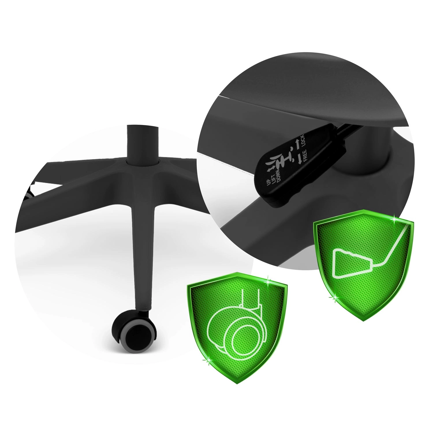 De duurzame SoftUp-gasveer maakt het mogelijk de zithoogte snel en nauwkeurig aan te passen voor ideale ergonomie aan elk bureau.