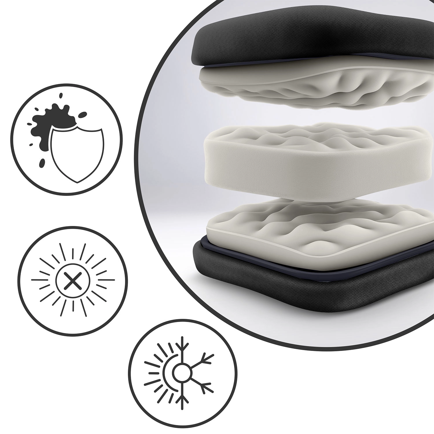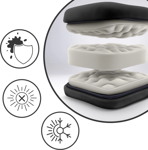 De dikke, veerkrachtige mat met een aangename hoes en een afneembaar hoofdkussen biedt uitstekend comfort voor hoofd en nek, zelfs tijdens langere rustmomenten.